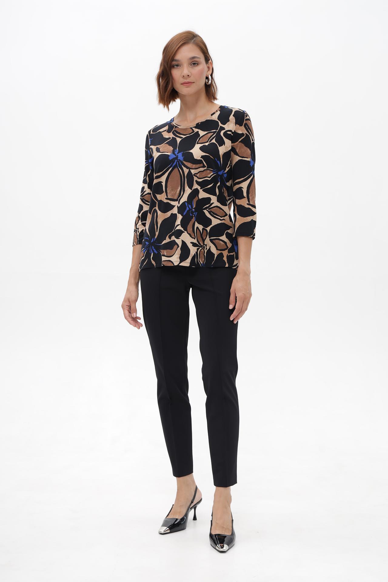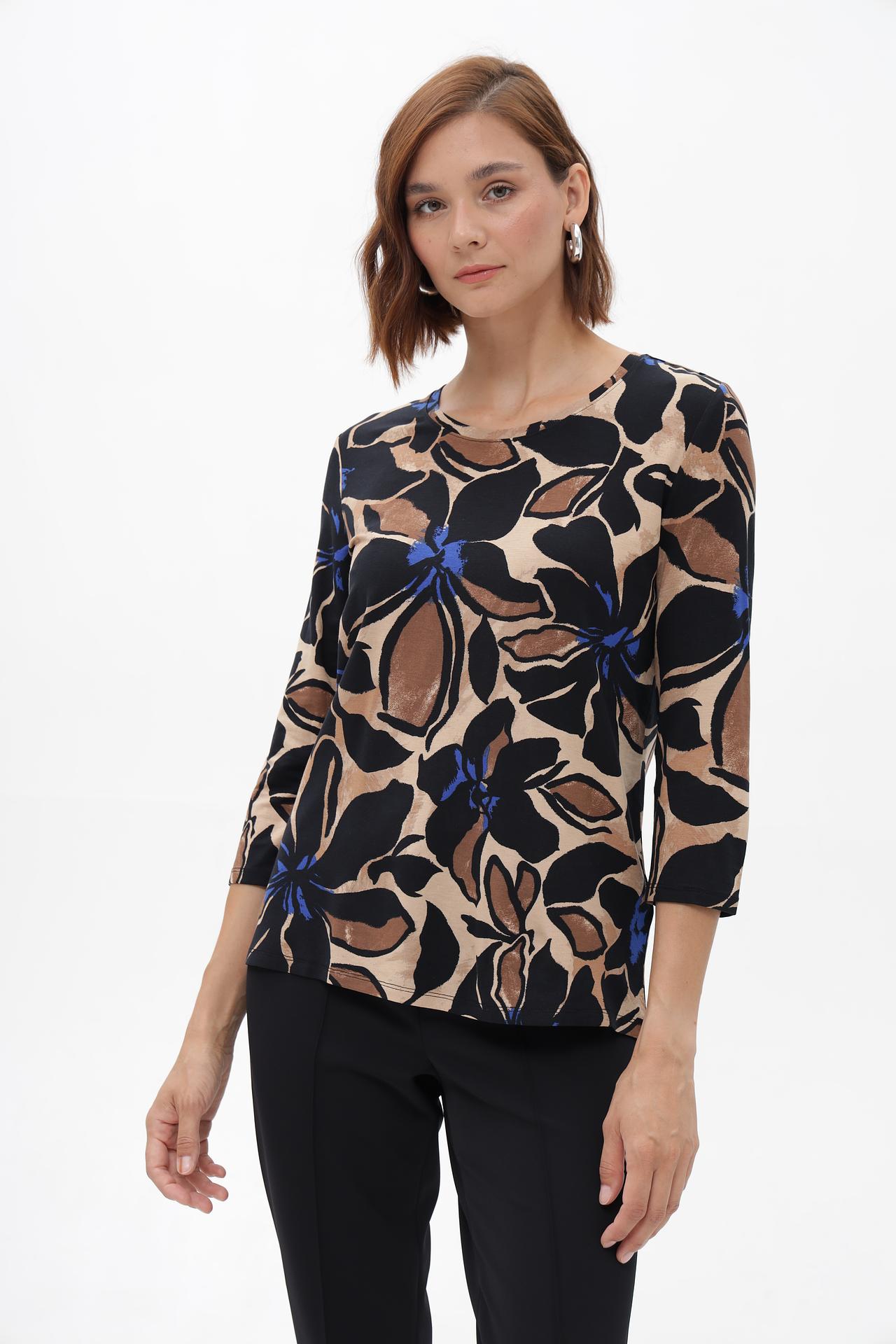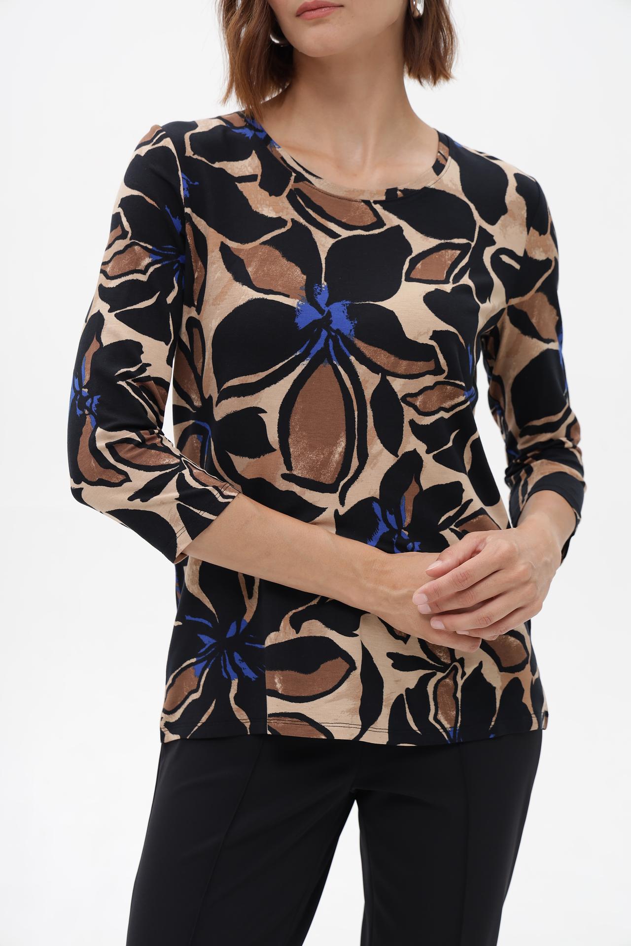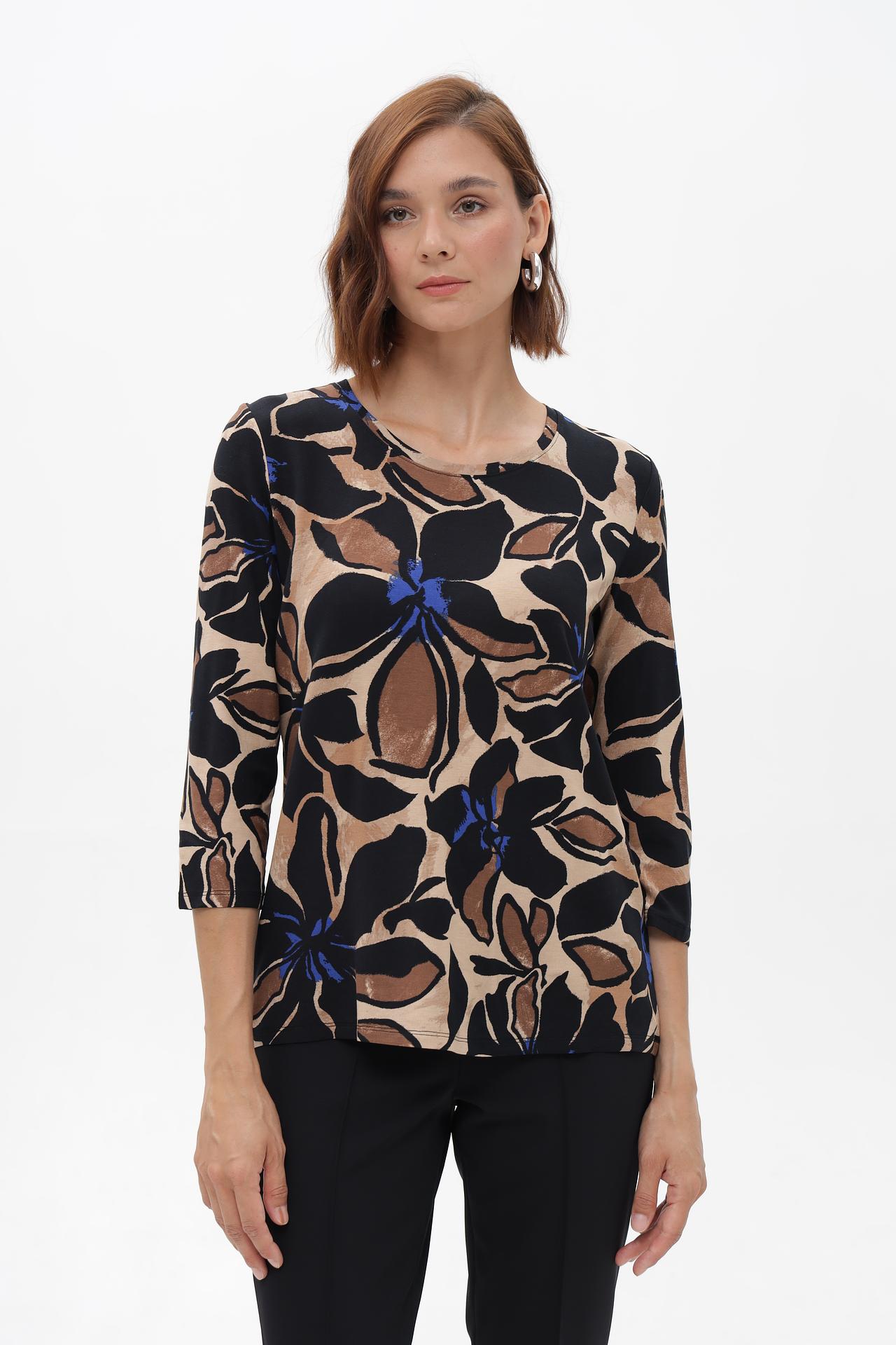 - Дизайн: Очаровательный принт с крупными цветами в контрастных тонах – черный, бежевый, коричневый и синий – создает выразительный и стильный образ. Классический крой с рукавом 3/4 универсален и подходит для любого случая.