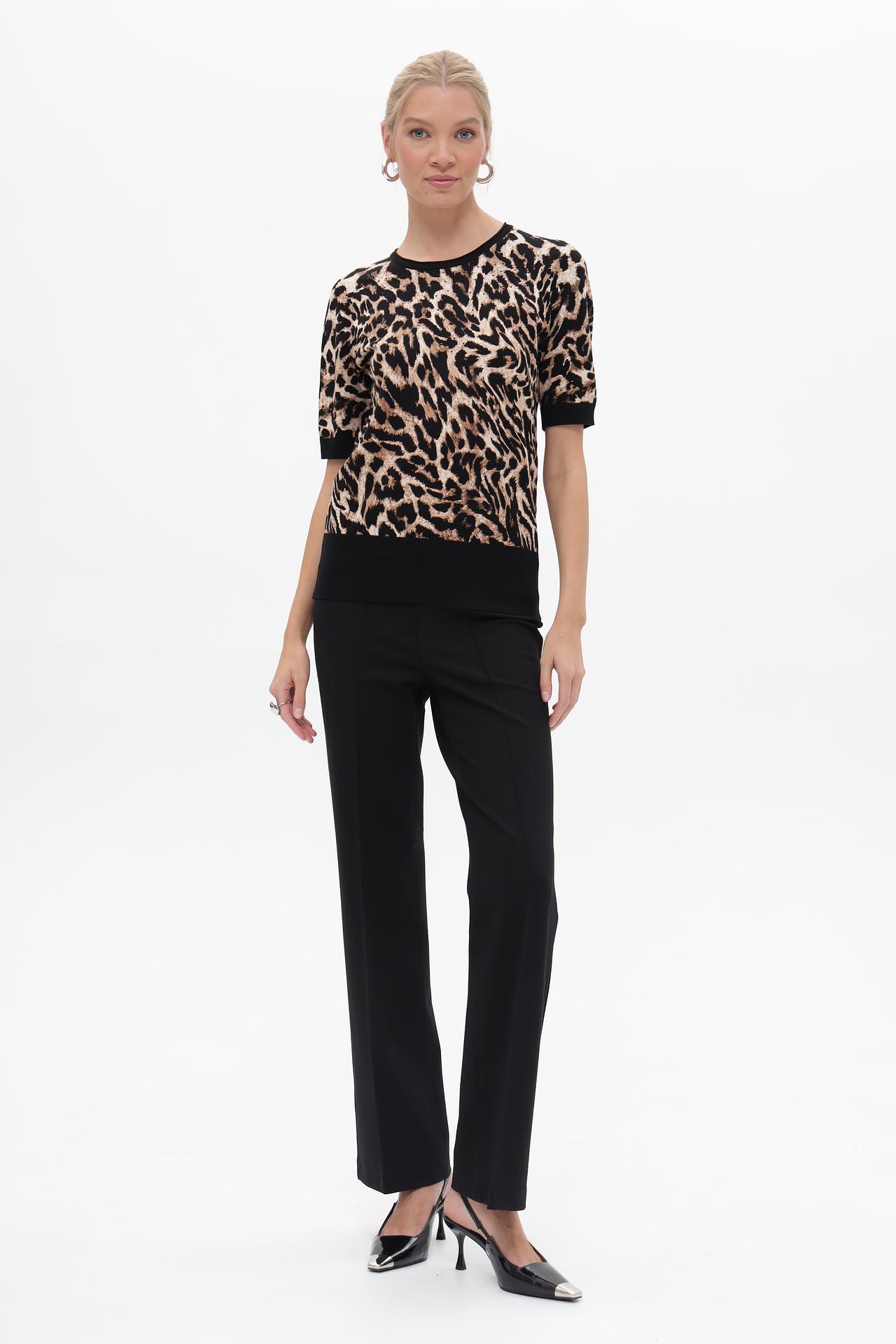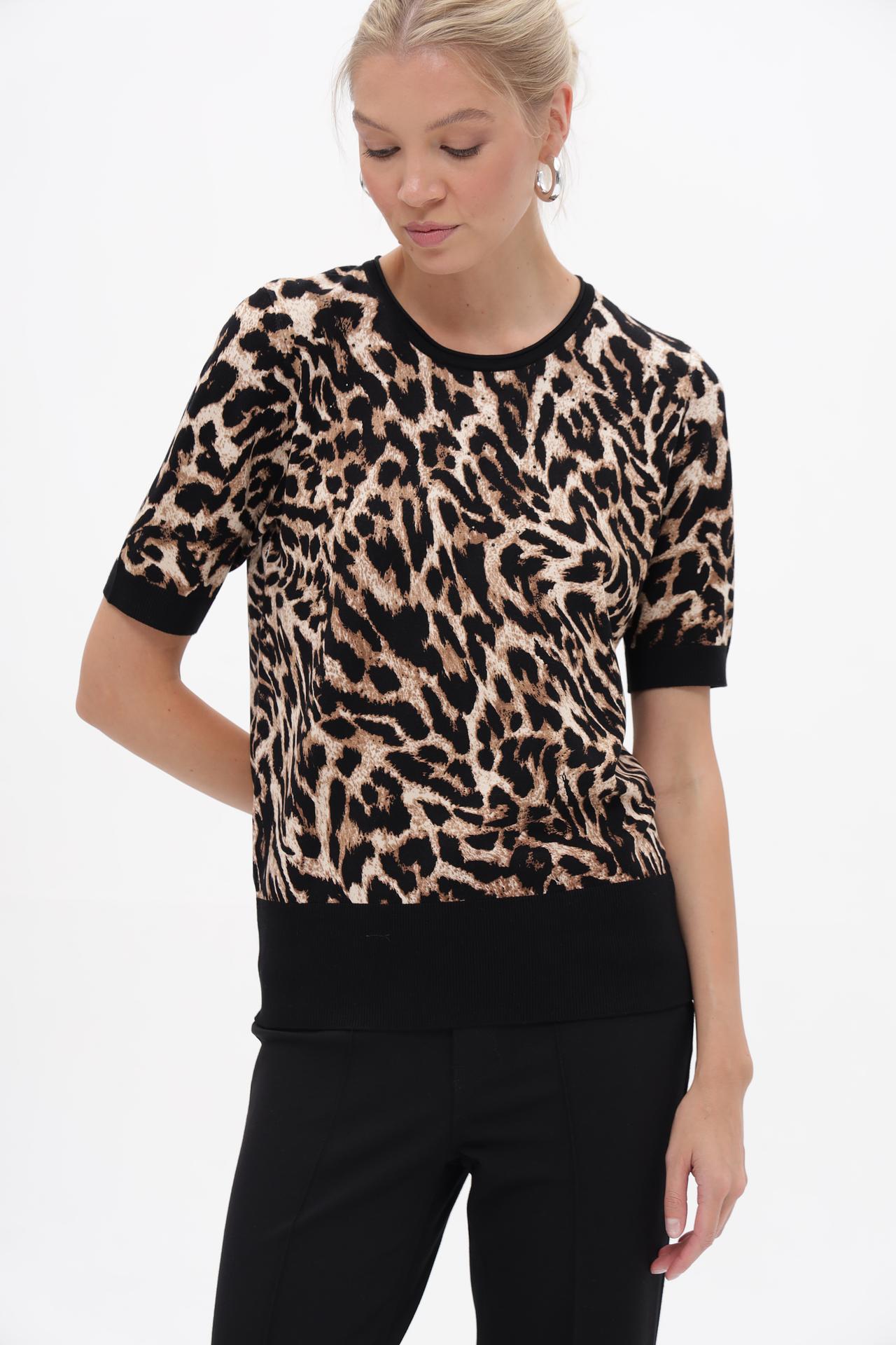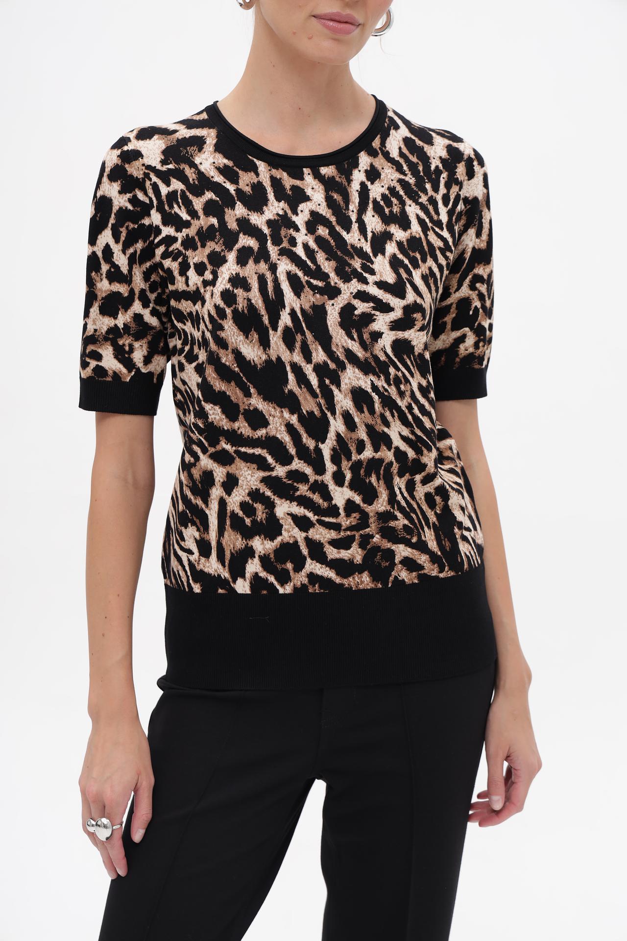 - Дизайн: Классический крой с коротким рукавом и круглым воротом дополнен трендовым леопардовым принтом, который акцентирует внимание на индивидуальности. Нижняя часть изделия и манжеты выполнены в контрастном черном цвете, что придает пуловеру завершенный и элегантный вид.
