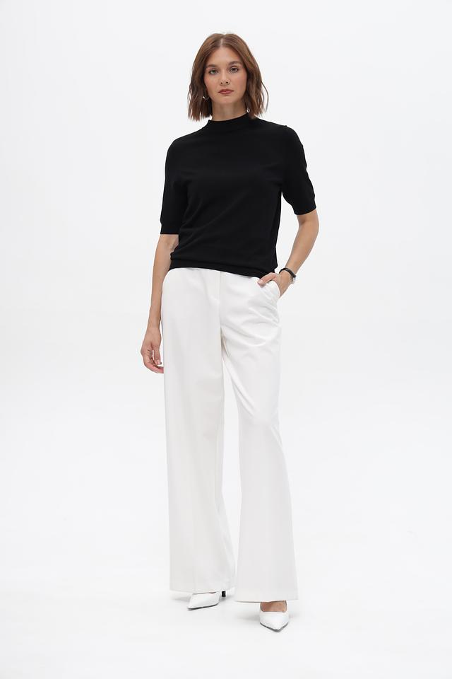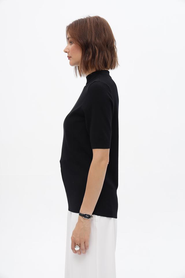 Пуловер имеет прямой крой и короткий рукав, что делает его идеальным для тёплой погоды или для создания многослойных луков. Высокий воротник добавляет изысканности и позволяет носить изделие как самостоятельный элемент, так и под жакет или пальто.
