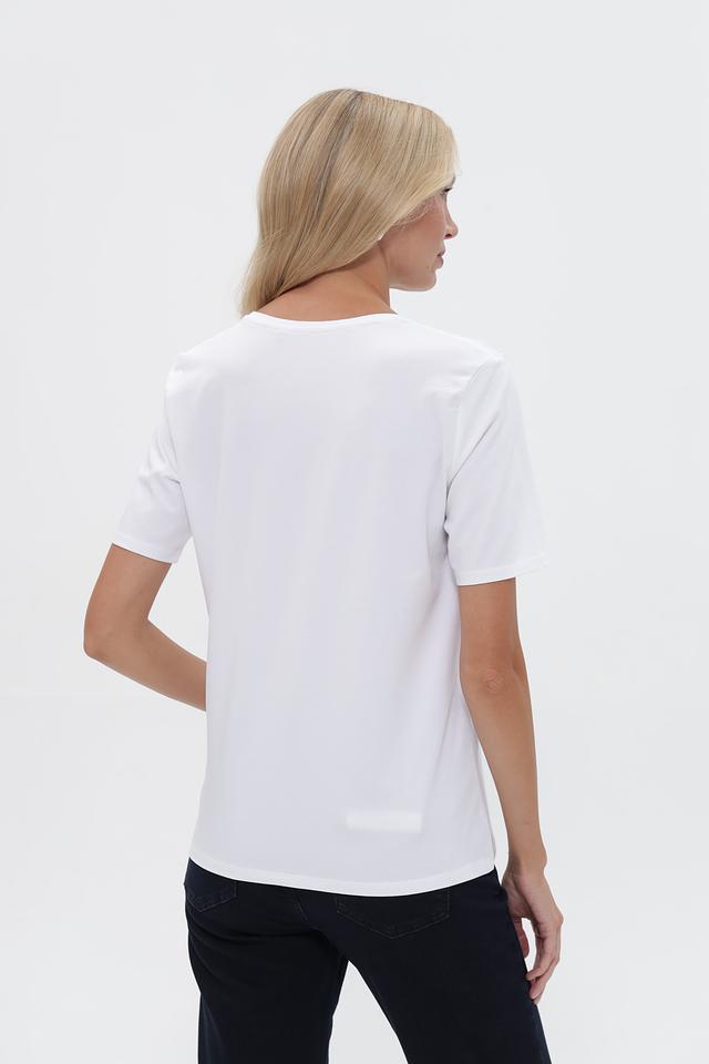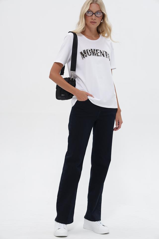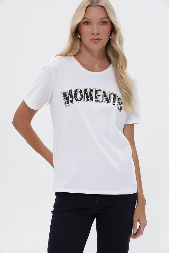 Основной цвет футболки – белый. Передняя часть украшена эффектной надписью “MOMENTS”, выполненной черным цветом и декорированной стразами, что придает изделию стильный и запоминающийся вид.