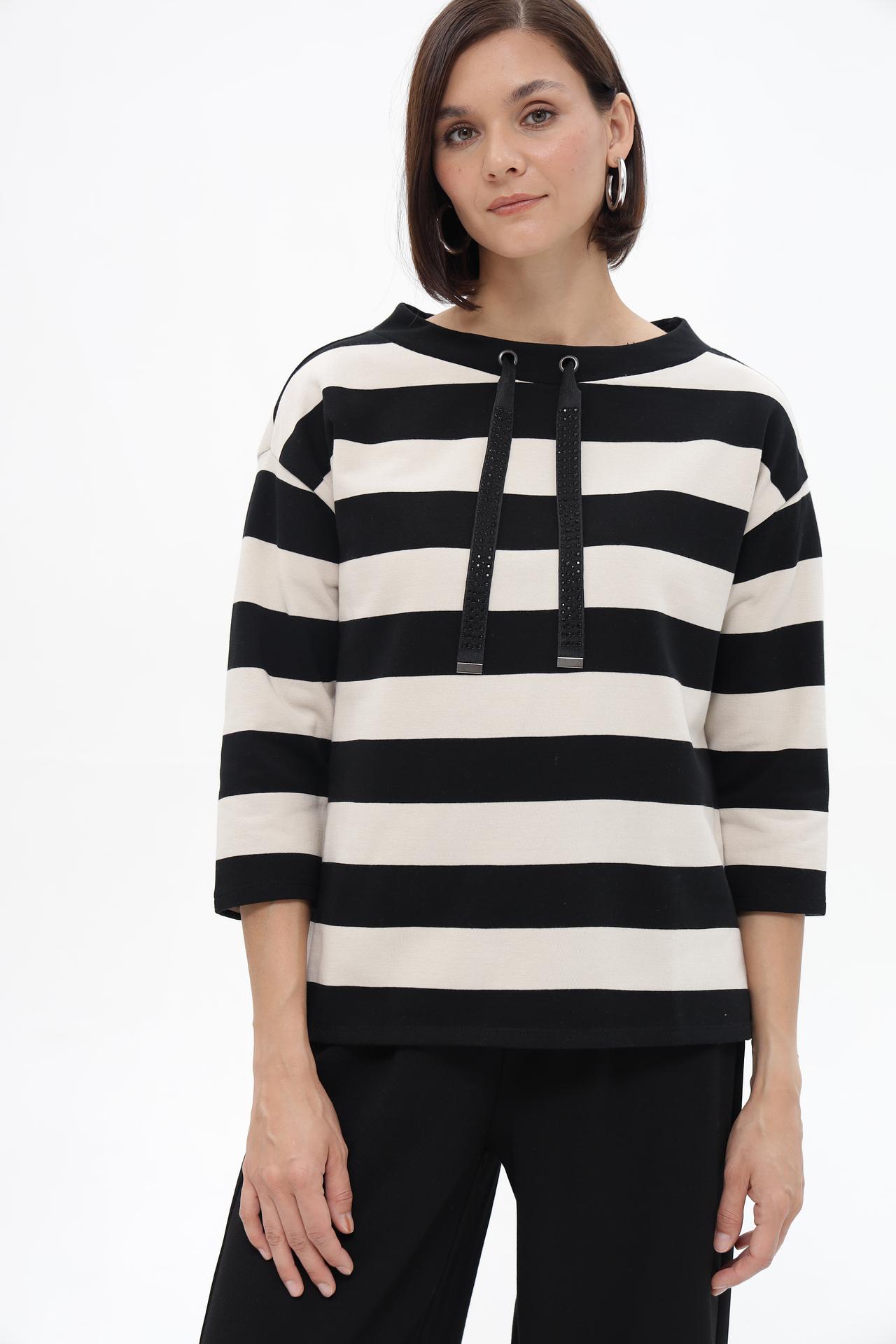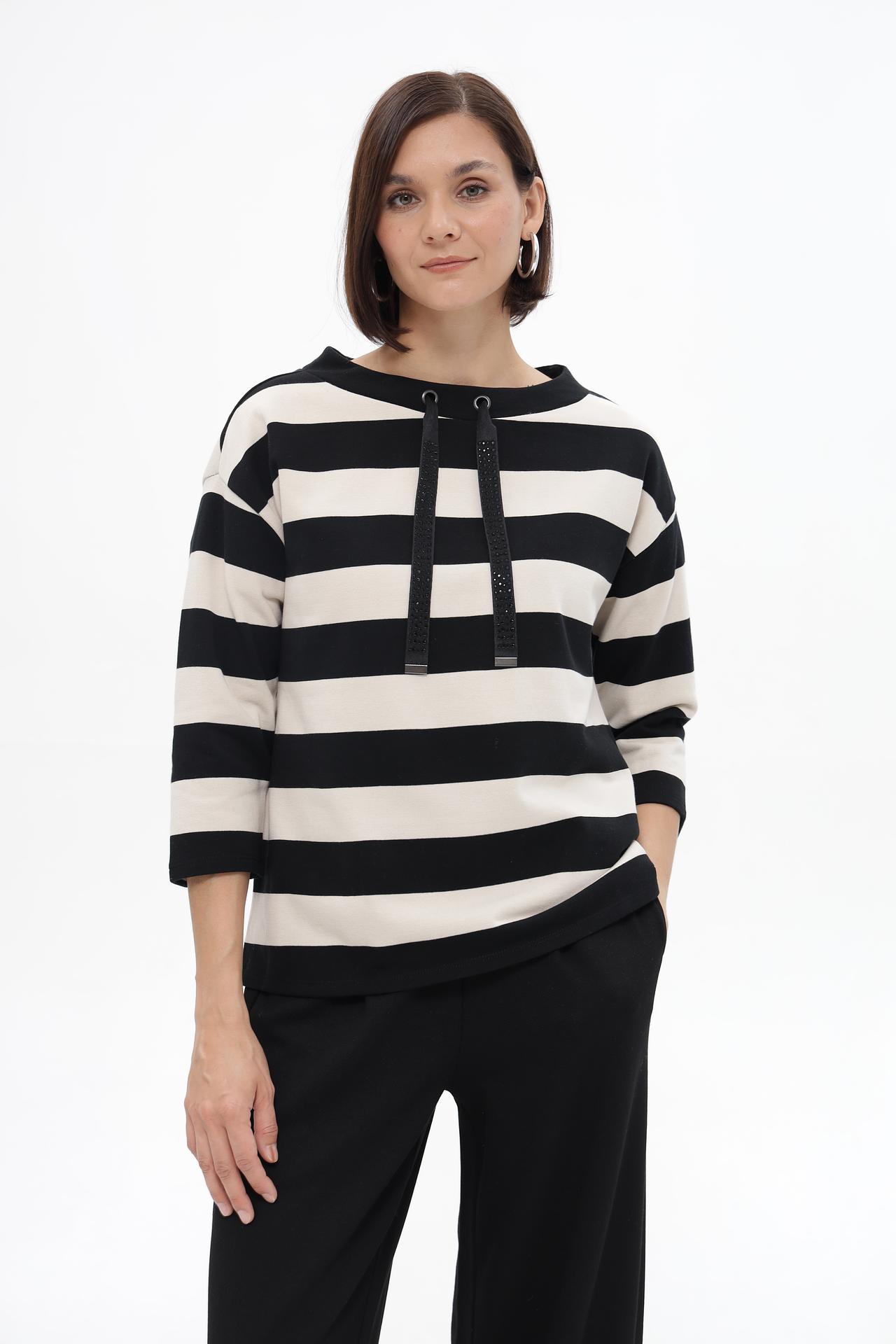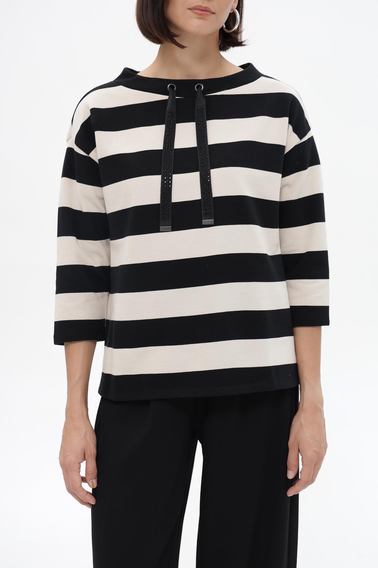 Стильный пуловер от Betty Barclay в классическую черно-белую полоску станет незаменимой вещью в вашем гардеробе. Модель свободного кроя с рукавом три четверти обеспечивает максимальный комфорт и свободу движений. Декоративная шнуровка с кристаллами на вороте добавляет изделию изысканности и женственности. Этот пуловер идеально подойдет для создания как повседневных, так и более элегантных образов.