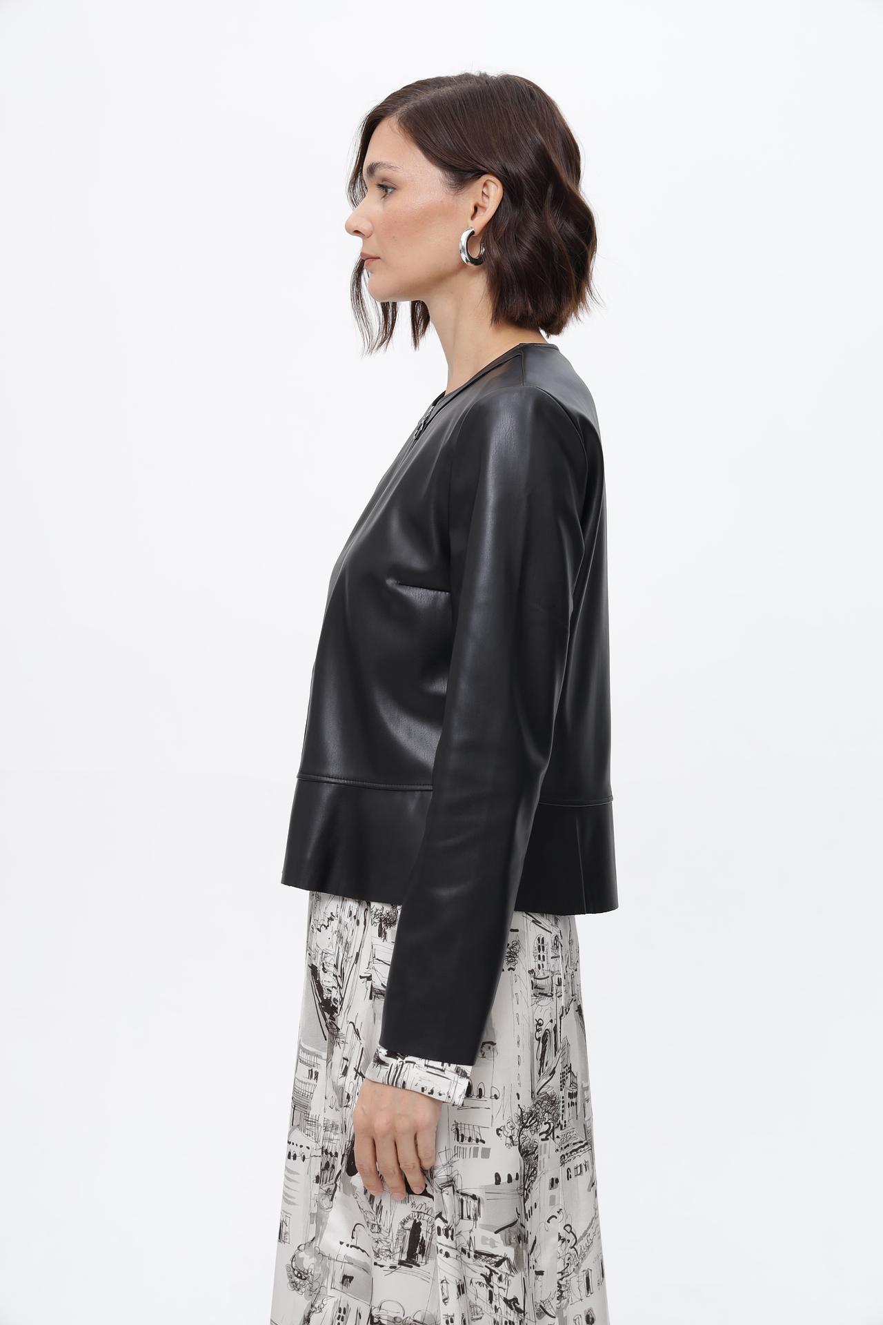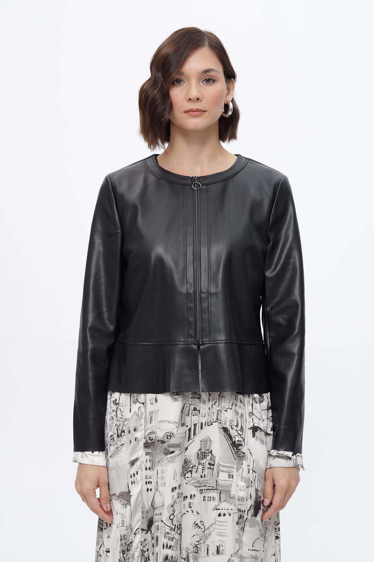 - Дизайн: Жакет имеет лаконичный крой с круглым вырезом и застежкой-молнией по центру. Отсутствие воротника и минималистичный дизайн делают эту модель универсальной.