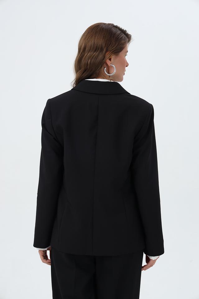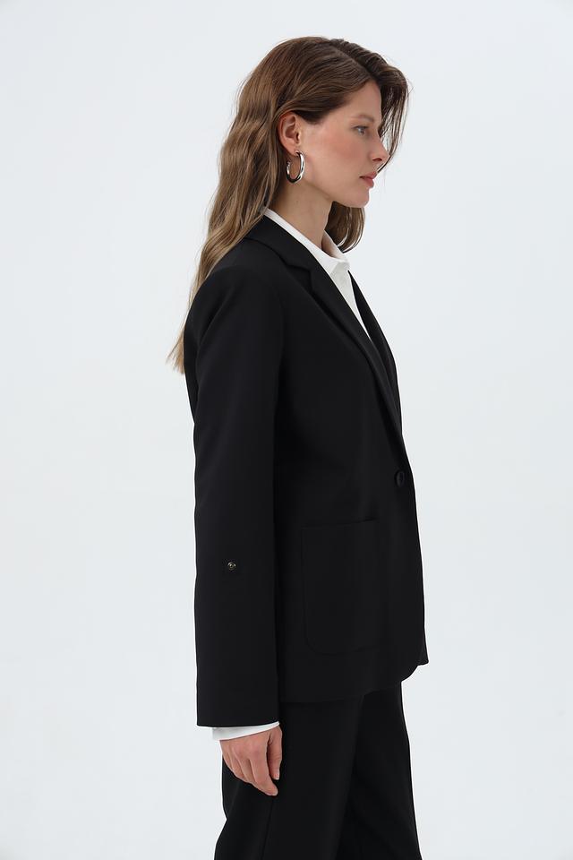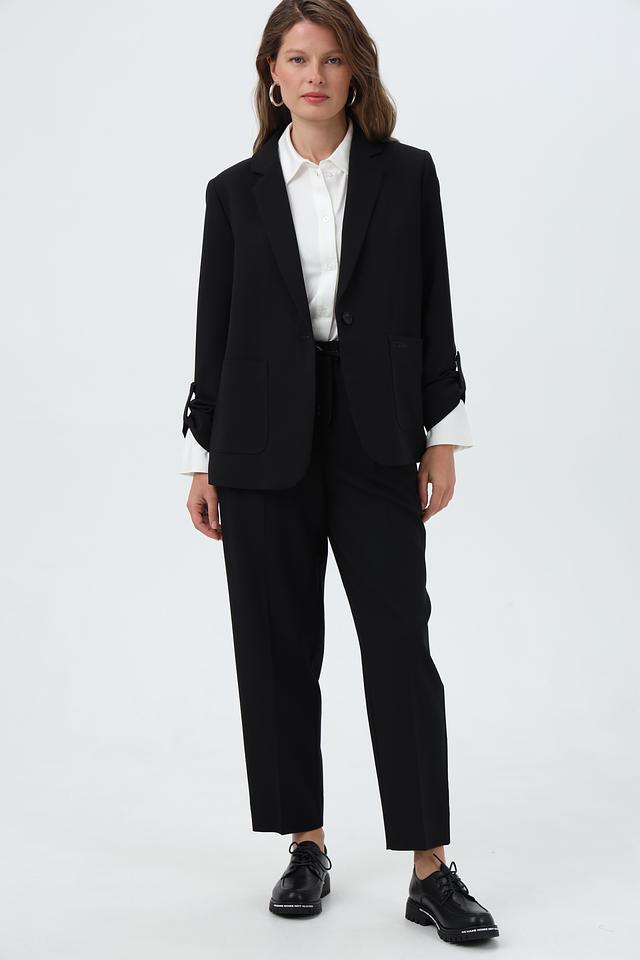 Жакет застегивается на одну пуговицу, имеет лацканы и два накладных кармана. Длинные рукавы дополняют элегантный силуэт.