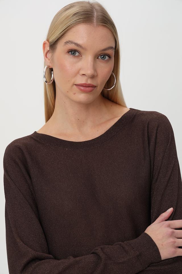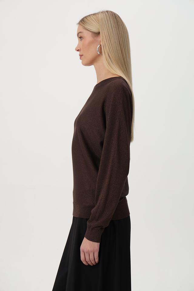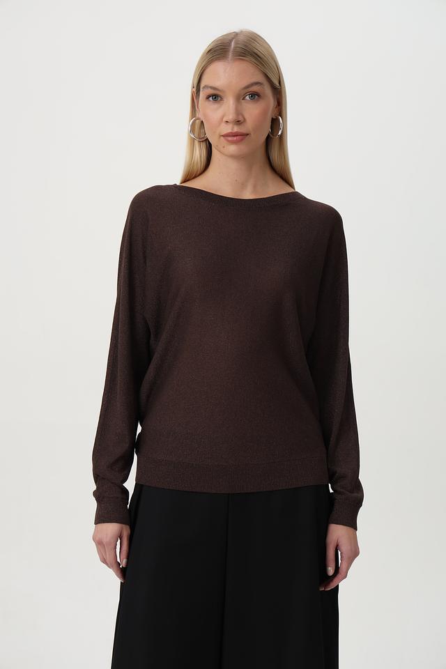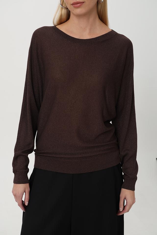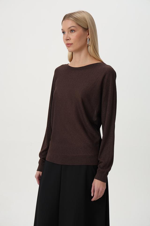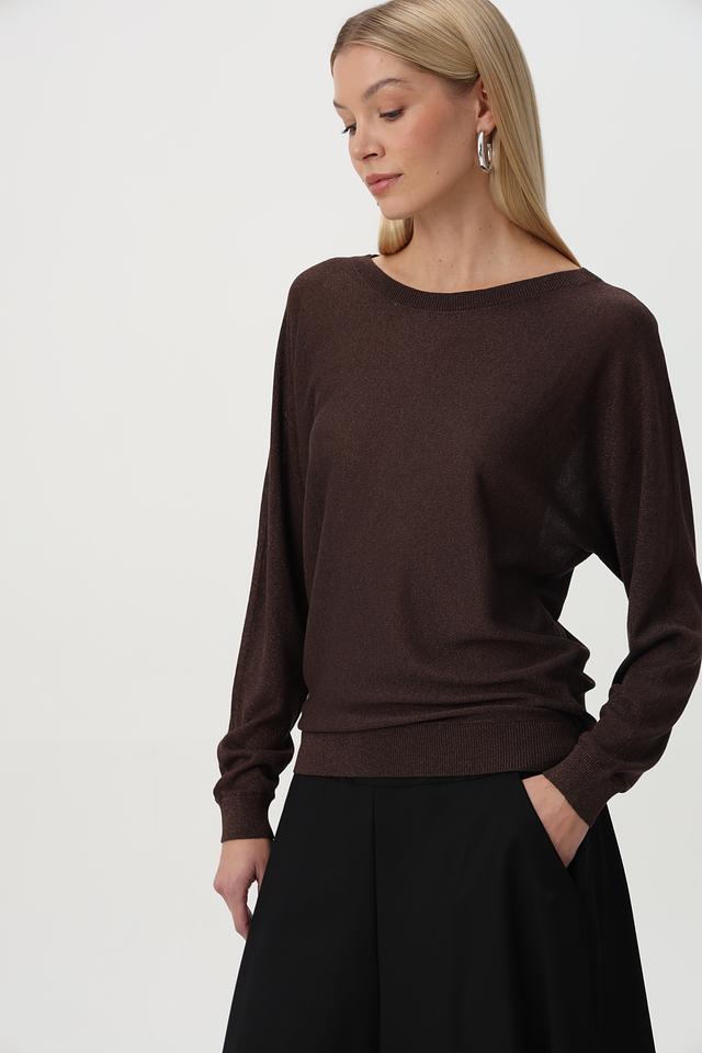Модель имеет округлый вырез “лодочка” и длинные рукава, обеспечивающие комфорт и свободу движений. Пуловер имеет слегка свободный крой, что делает его универсальным для различных типов фигур.