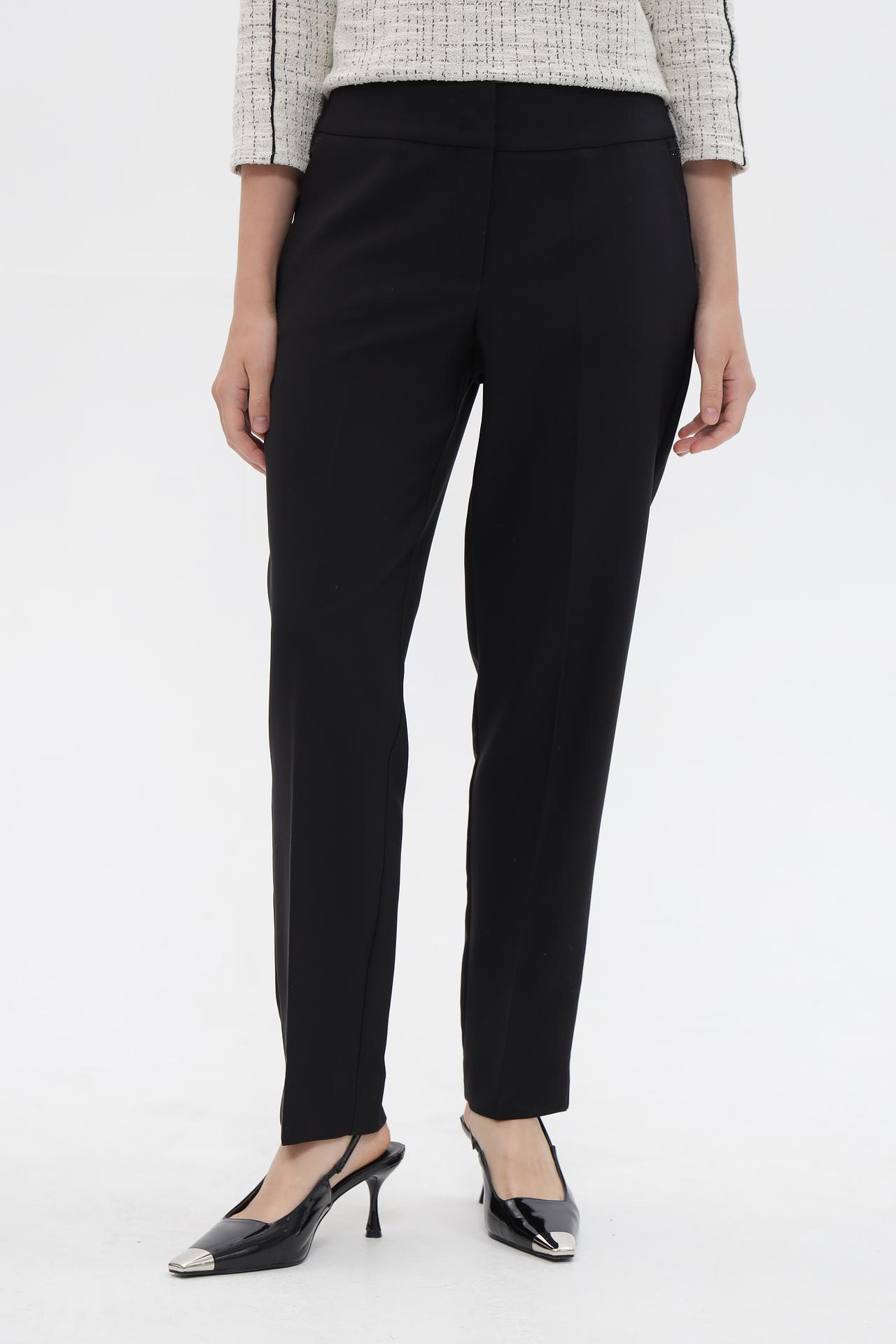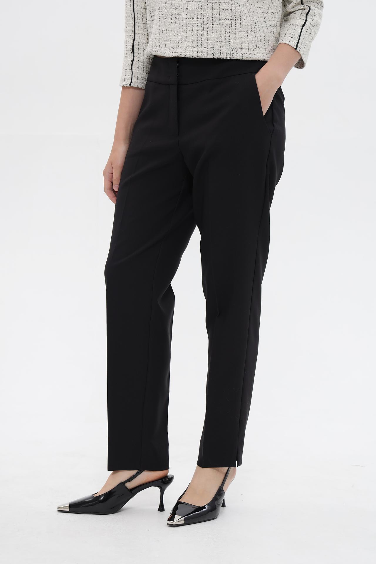 - Крой: Прямой крой с умеренно зауженными книзу штанинами создает элегантный силуэт. Брюки прекрасно садятся по фигуре, подчеркивая ее достоинства.