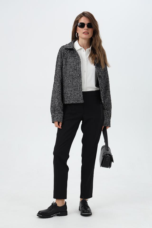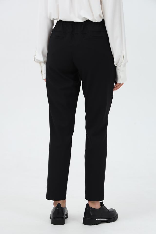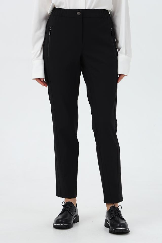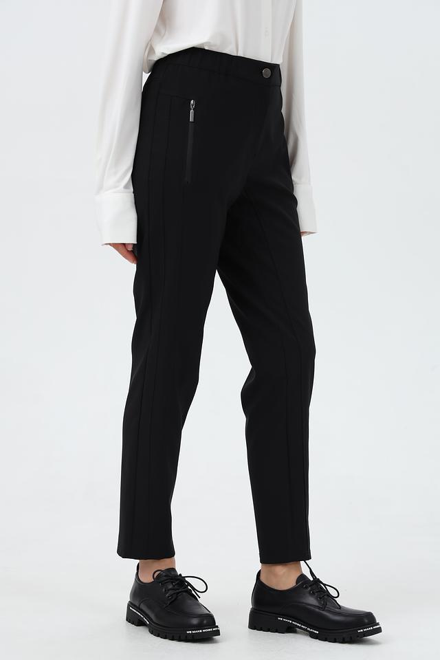 Модель имеет высокую посадку и укороченный крой, подчеркивающий стройность ног. Боковые карманы на молнии не только функциональны, но и добавляют брюкам современный вид. Вертикальные вытачки спереди придают брюкам более аккуратный силуэт.