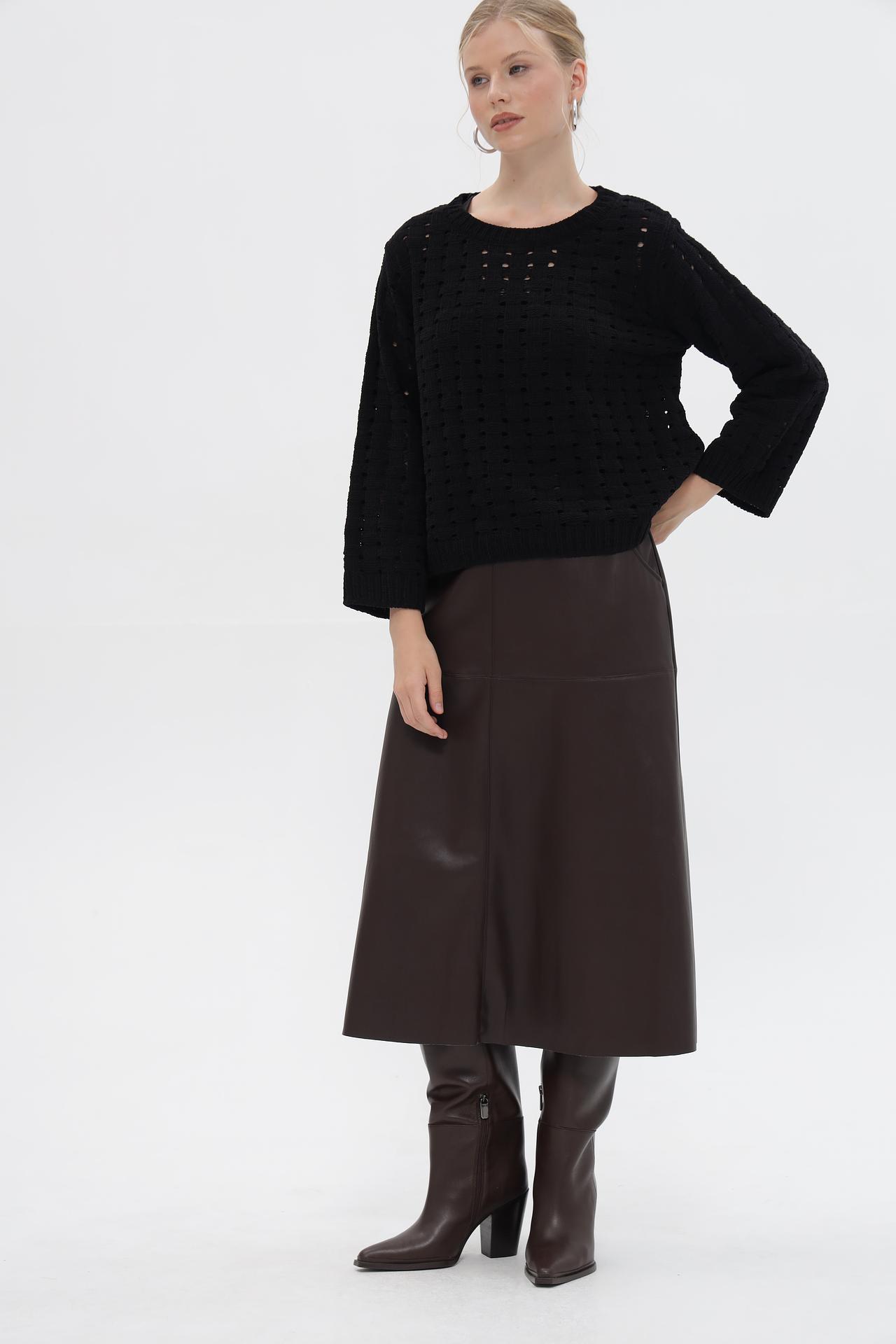 - Материал: Изделие выполнено из 100% полиэстера с покрытием из 100% полиуретана, что обеспечивает долговечность, износостойкость и приятные тактильные ощущения. Материал имитирует натуральную кожу, придавая юбке эффектный внешний вид.