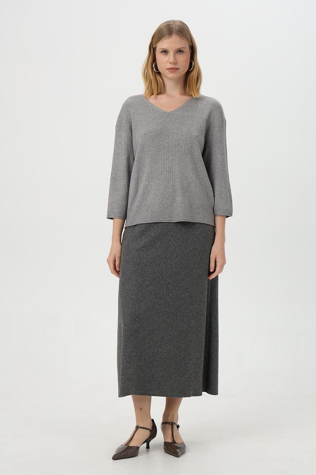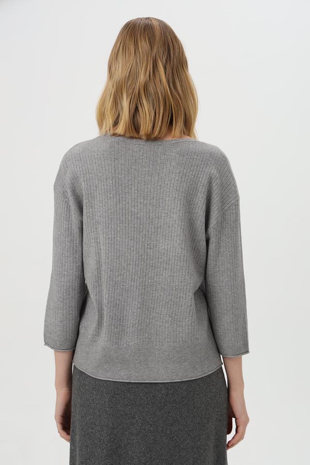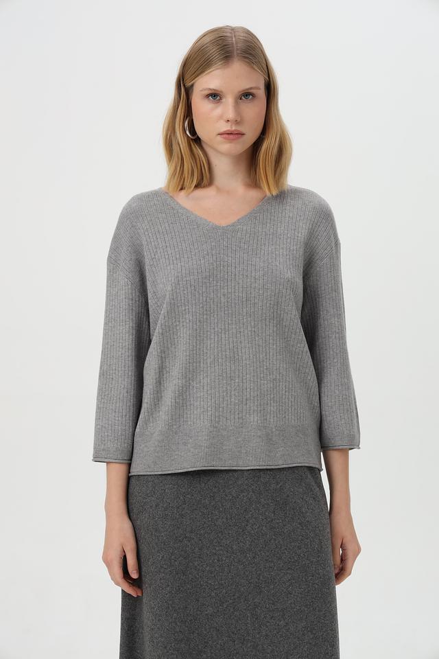 Пуловер имеет V-образный вырез, который визуально удлиняет шею и делает образ более изящным. Рукав три четверти добавляет женственности и подходит для любого времени года.