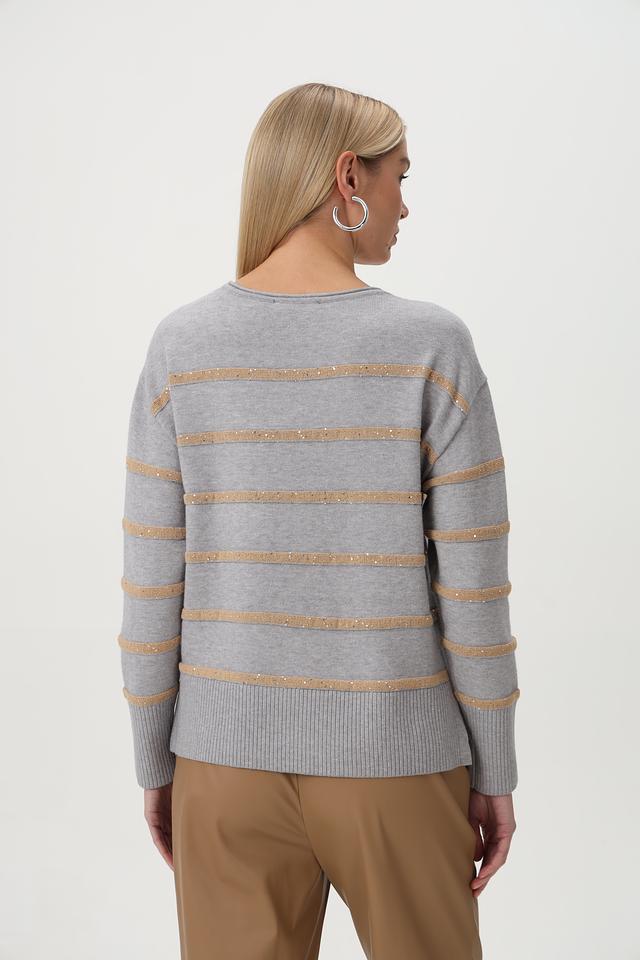 Пуловер имеет прямой крой и длинные рукава, а также круглый вырез горловины. Особый акцент сделан на горизонтальные полоски, которые украшены золотистой отделкой, придающей изделию изысканность и блеск.