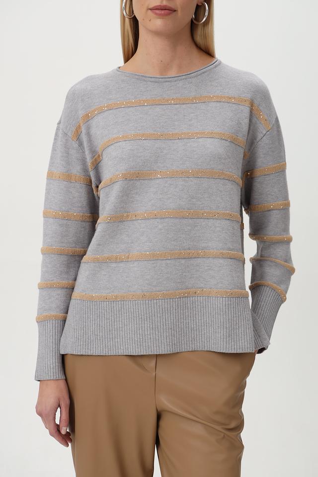 Серый пуловер от Betty Barclay с горизонтальными полосками и золотистой отделкой. Изготовлен из мягкой смеси вискозы, полиэстера и полиамида. Состав: вискоза 44%, полиэстер 32%, полиамид 24%