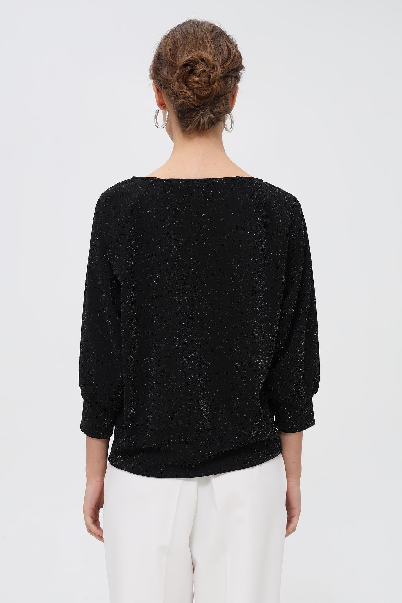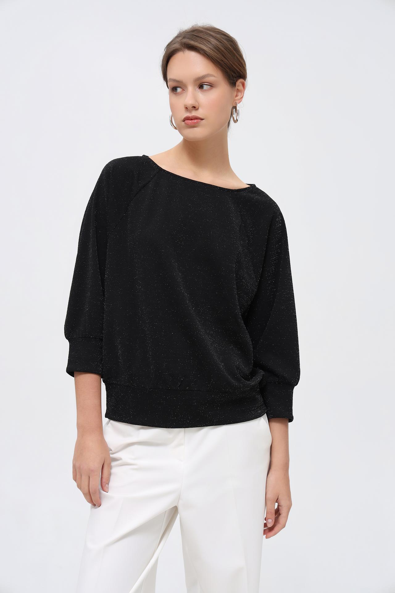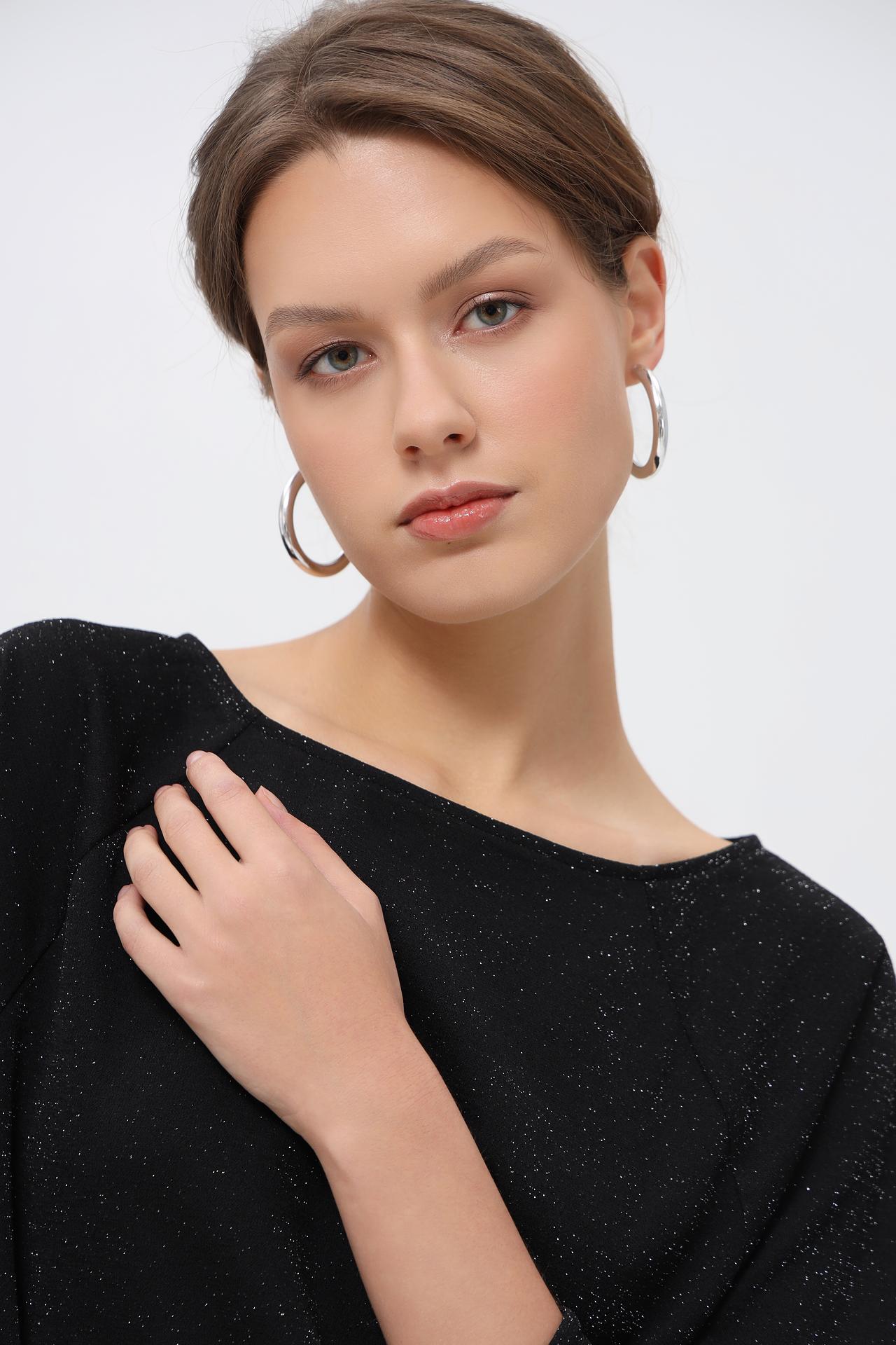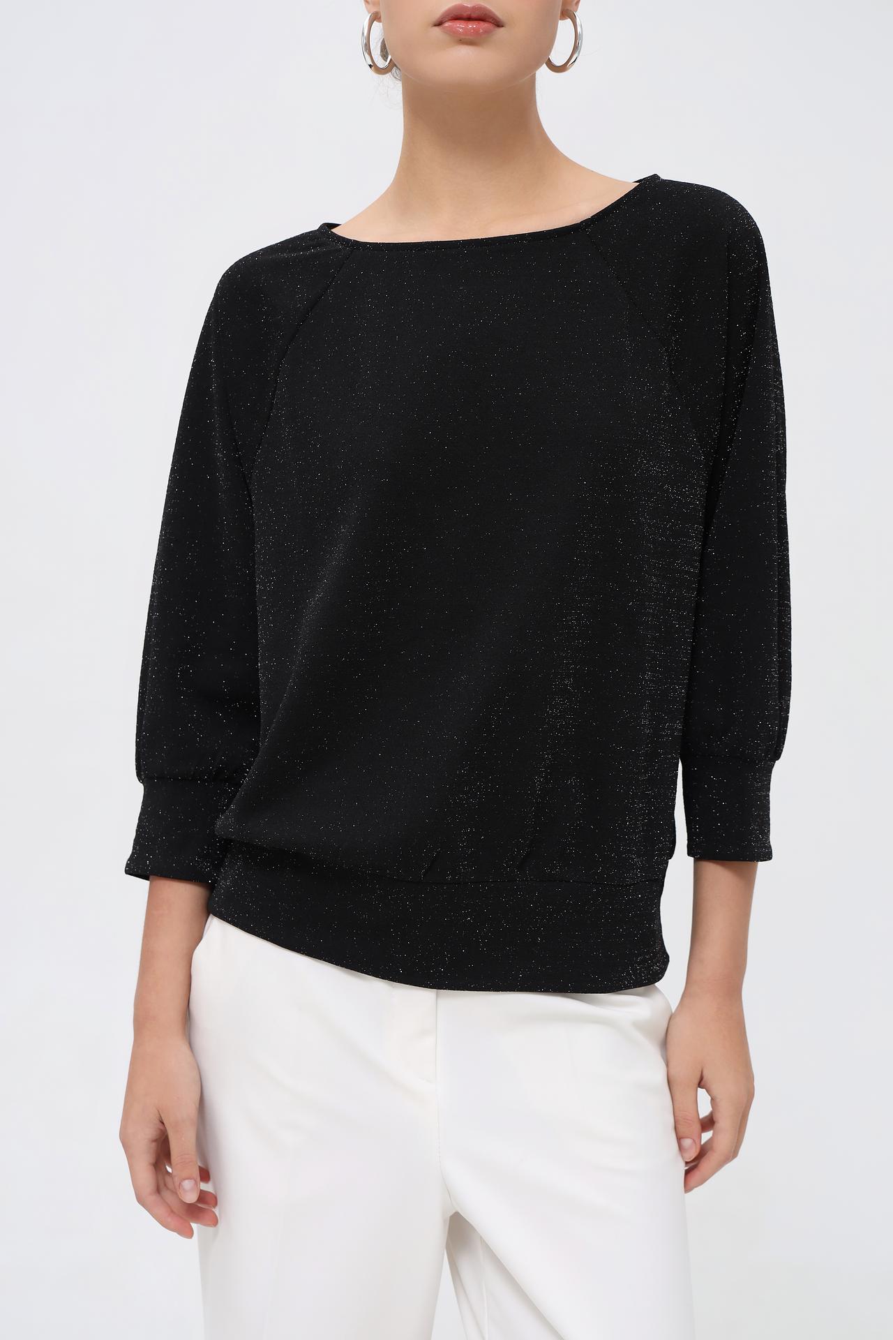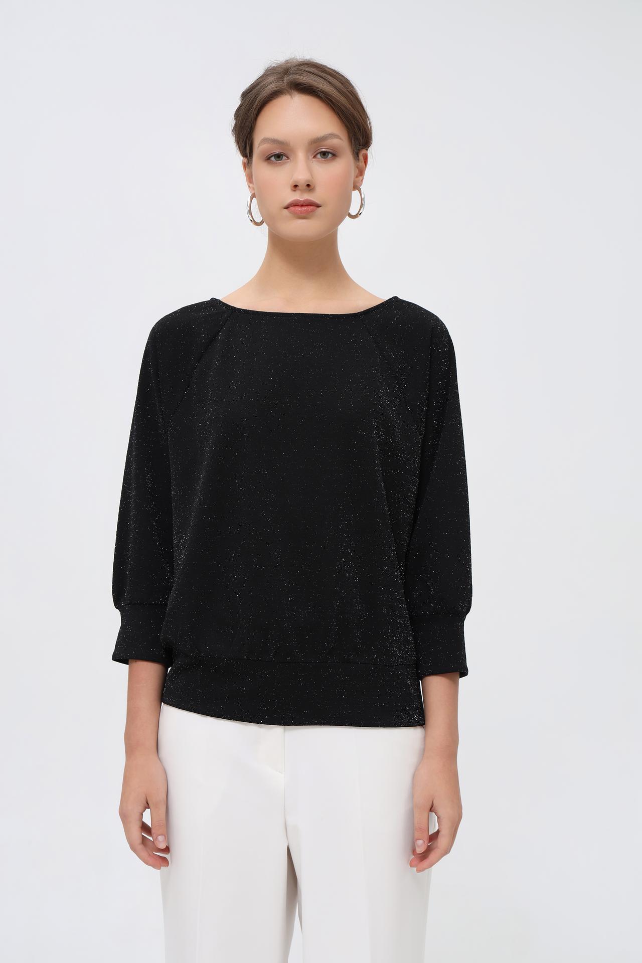 - Дизайн: Классический черный цвет в сочетании с мерцающим эффектом люрекса делает пуловер универсальным и элегантным. Широкий вырез лодочкой деликатно открывает линию плеч, придавая образу женственность.