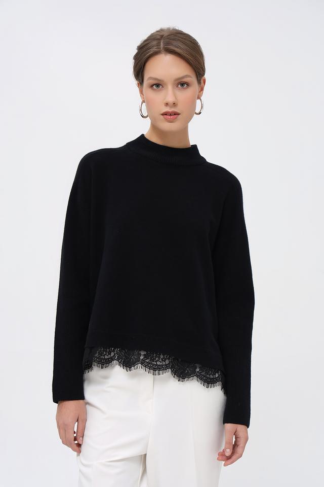Пуловер имеет классический крой с высоким воротником и длинными рукавами. Особый шарм изделию придаёт изящная отделка из чёрного кружева по нижнему краю.