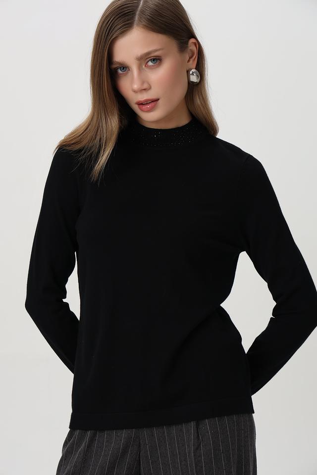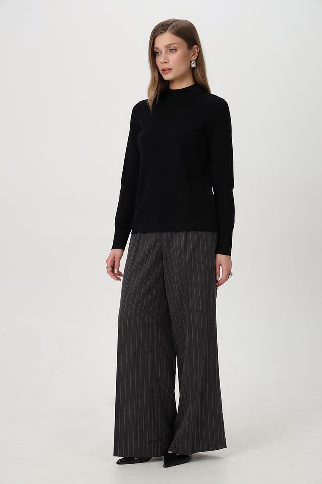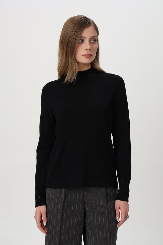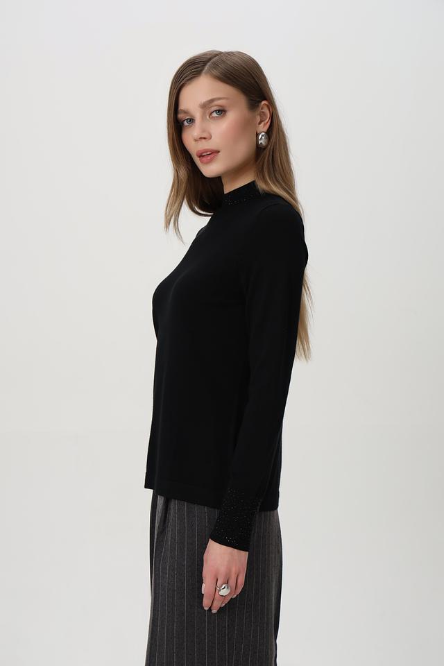 Пуловер имеет длинные рукава и высокий горл, что делает его идеальным для прохладной погоды. Декоративная отделка в виде мелких камней на горловине придает изделию особый шарм и изысканность.