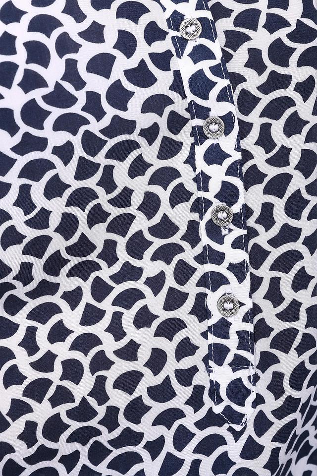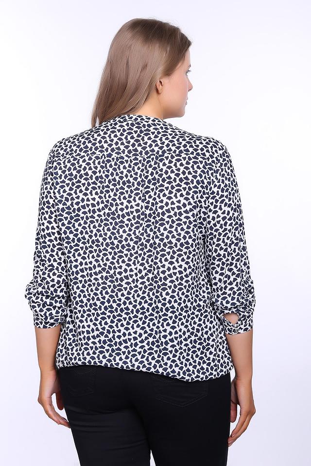 - Принт: Уникальный темно-синий принт на белом фоне привлекает внимание и придает блузе особый шарм. Этот узор легко сочетается с различными элементами одежды.