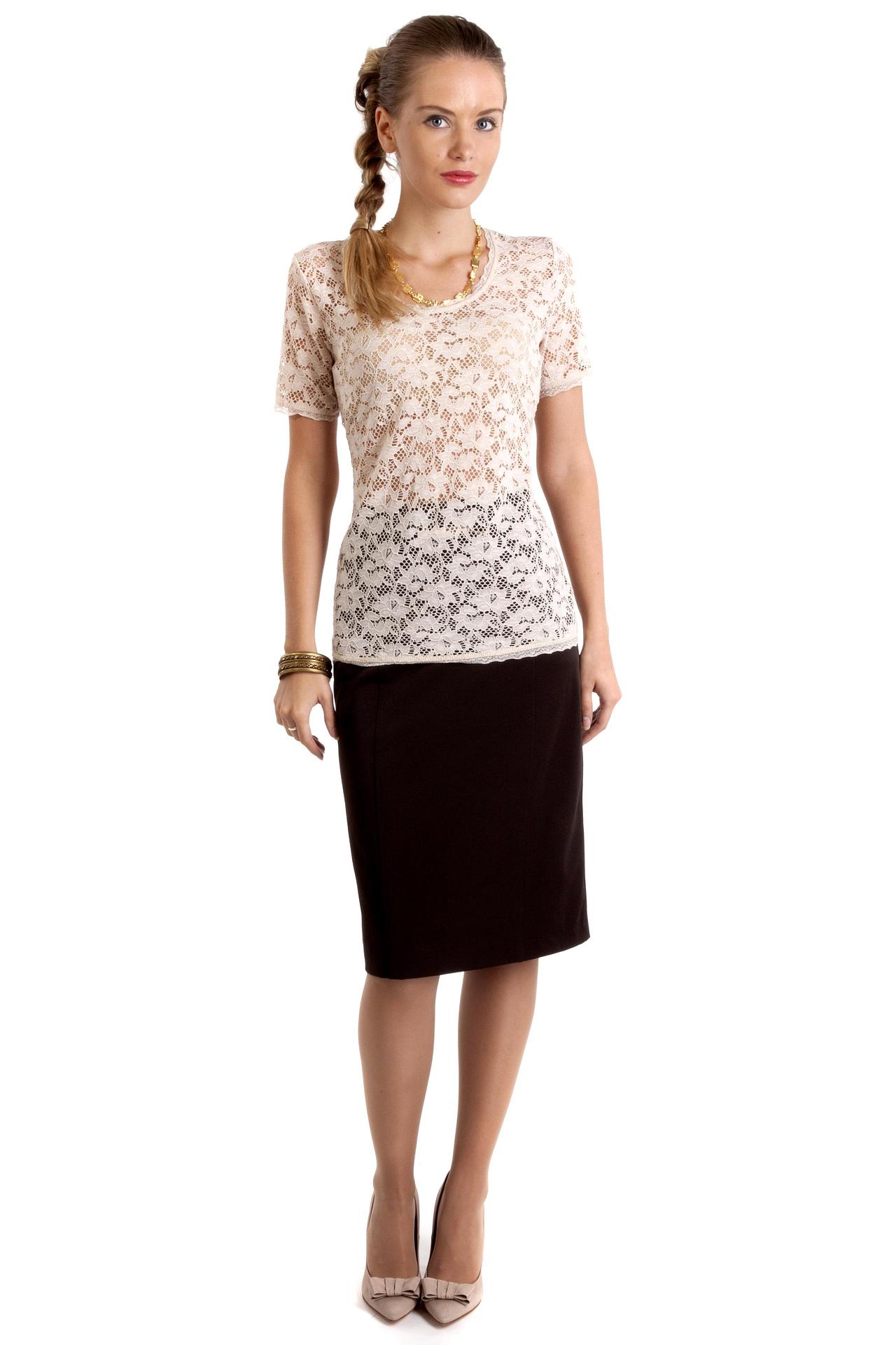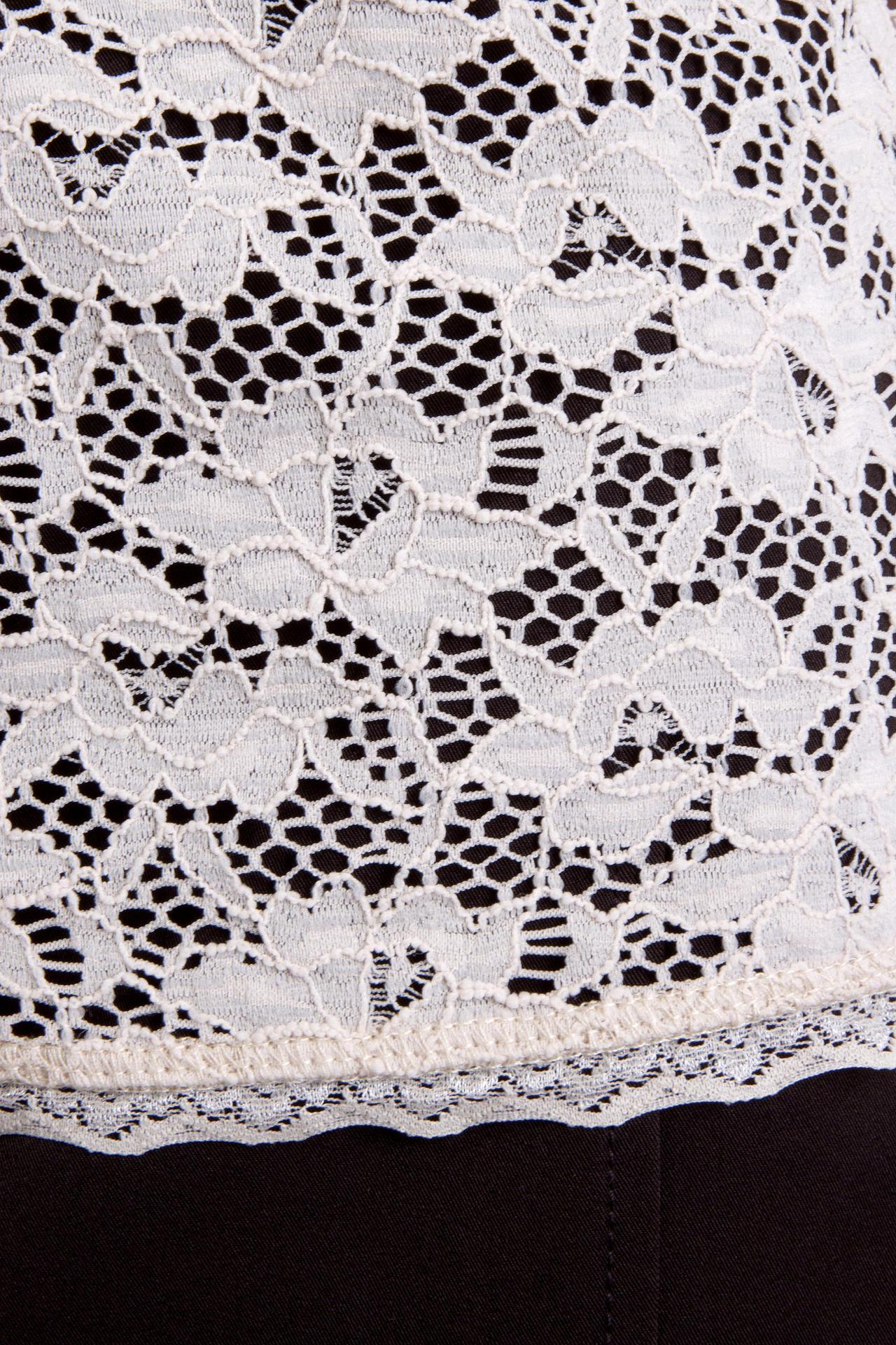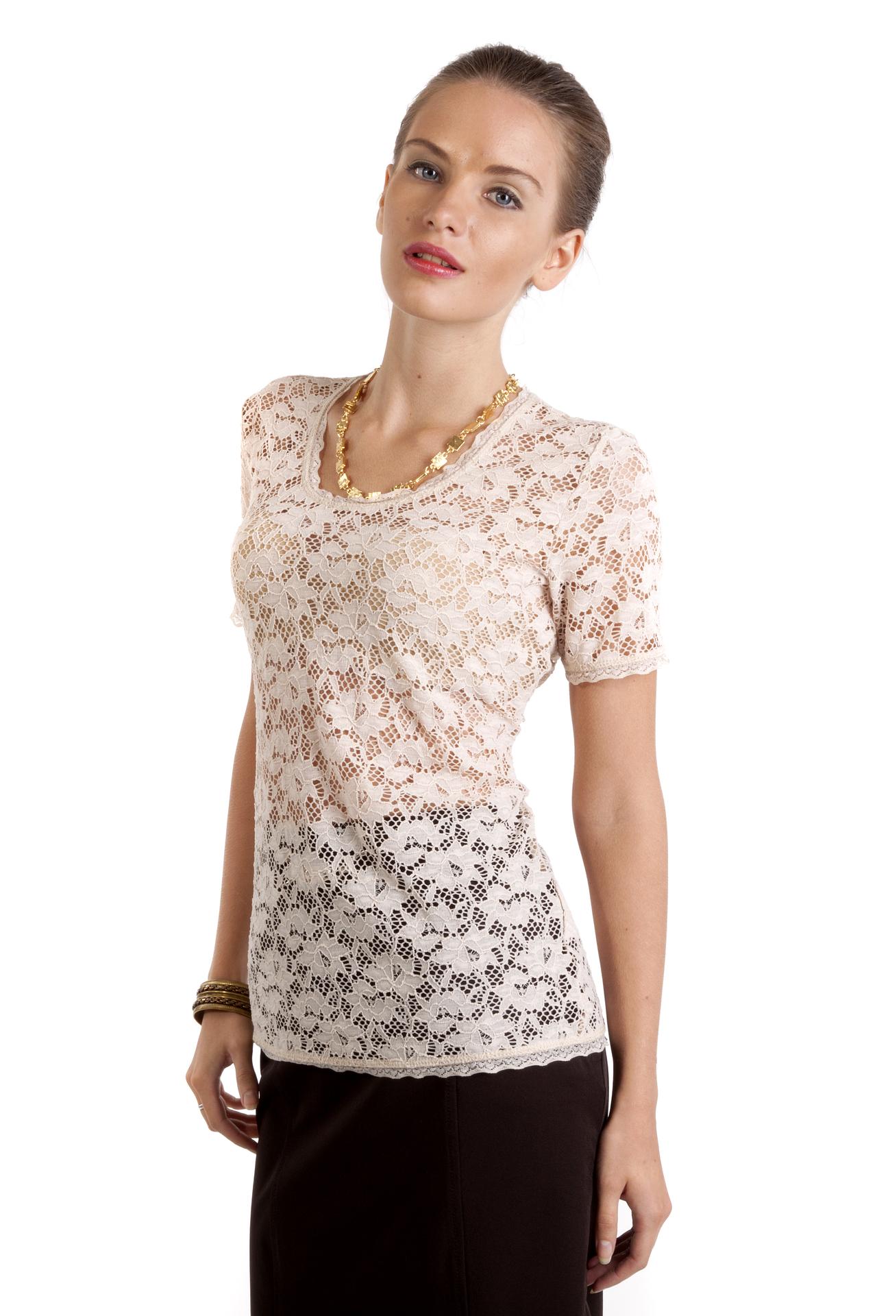 - Дизайн: Утонченное кружево с цветочным узором и оригинальным нижним краем добавляет изделию элегантности. Короткий рукав и квадратный вырез горловины создают женственный силуэт.