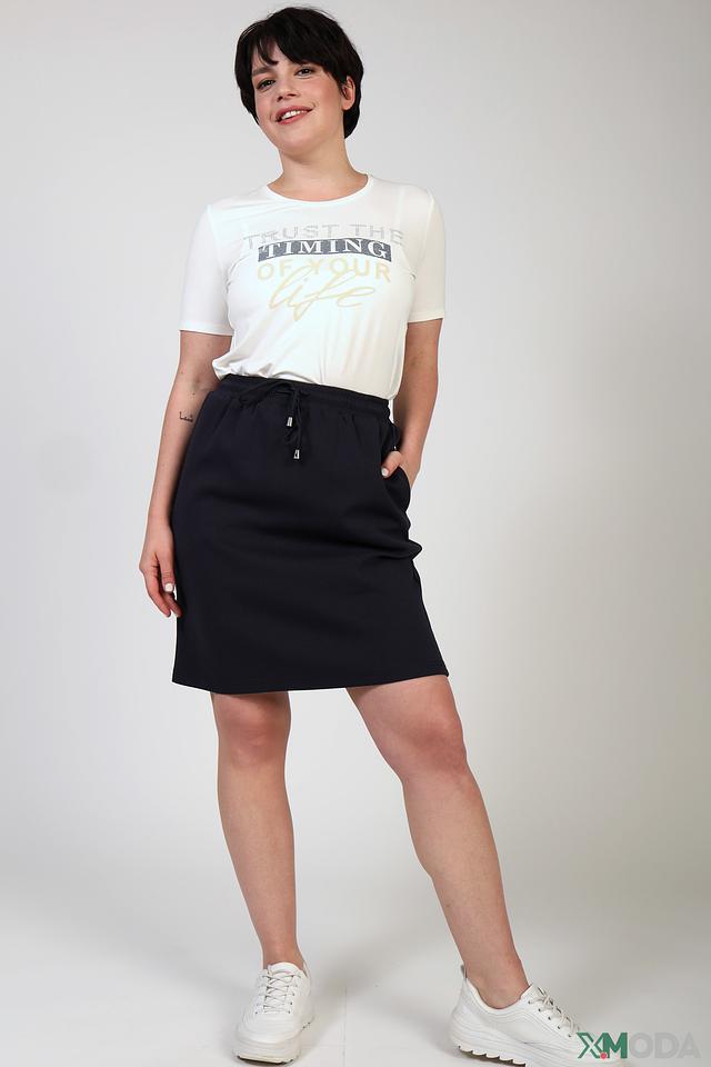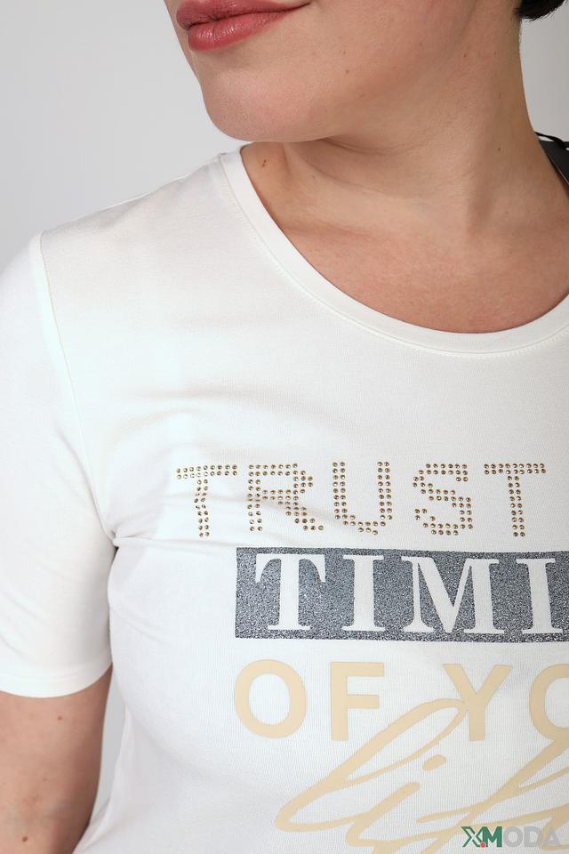 Белая футболка Betty Barclay с оригинальным принтом "Trust the timing of your life". Изготовлена из мягкой вискозы с добавлением эластана для комфорта и хорошей посадки. Идеальный выбор для создания повседневного образа. Состав: вискоза 95%, эластан 5%