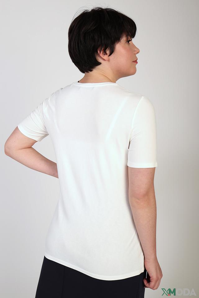 Модель имеет классический крой с короткими рукавами и круглым вырезом горловины. Ткань, состоящая из 95% вискозы и 5% эластана, приятна к телу, хорошо драпируется и обеспечивает комфорт в носке.