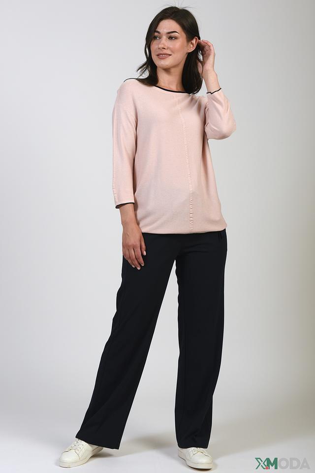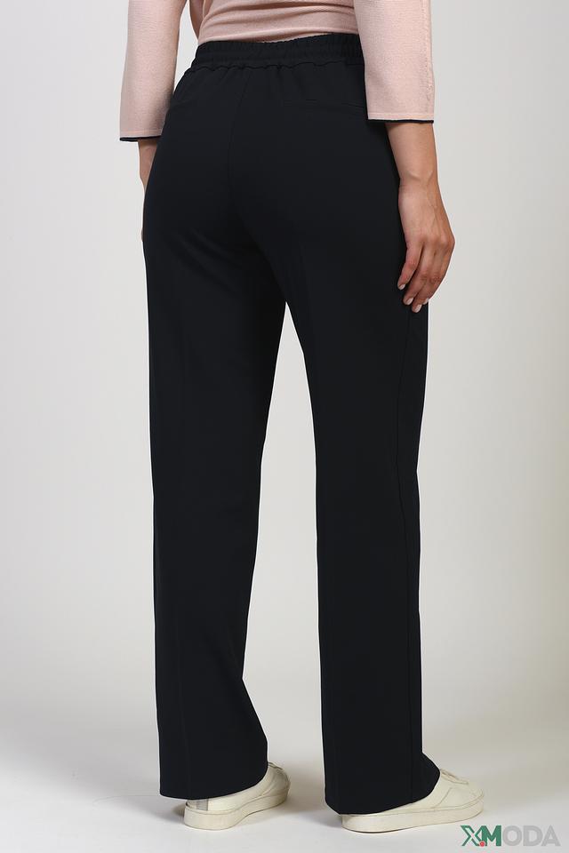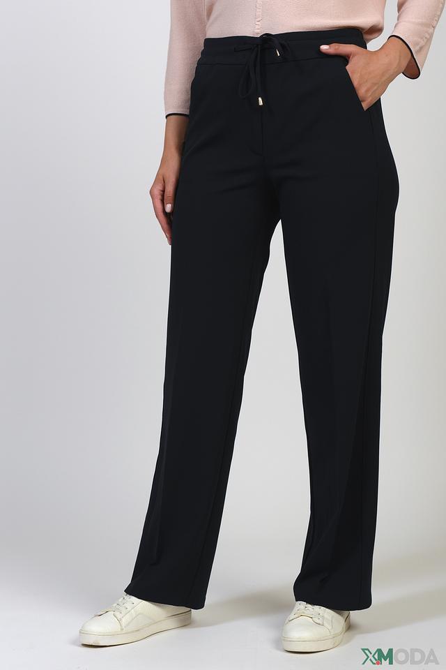 Брюки имеют прямой крой и пояс на эластичной резинке с декоративными завязками и металлическими наконечниками. Это обеспечивает комфортную посадку и возможность регулировать облегание. Ткань приятна на ощупь и хорошо держит форму.