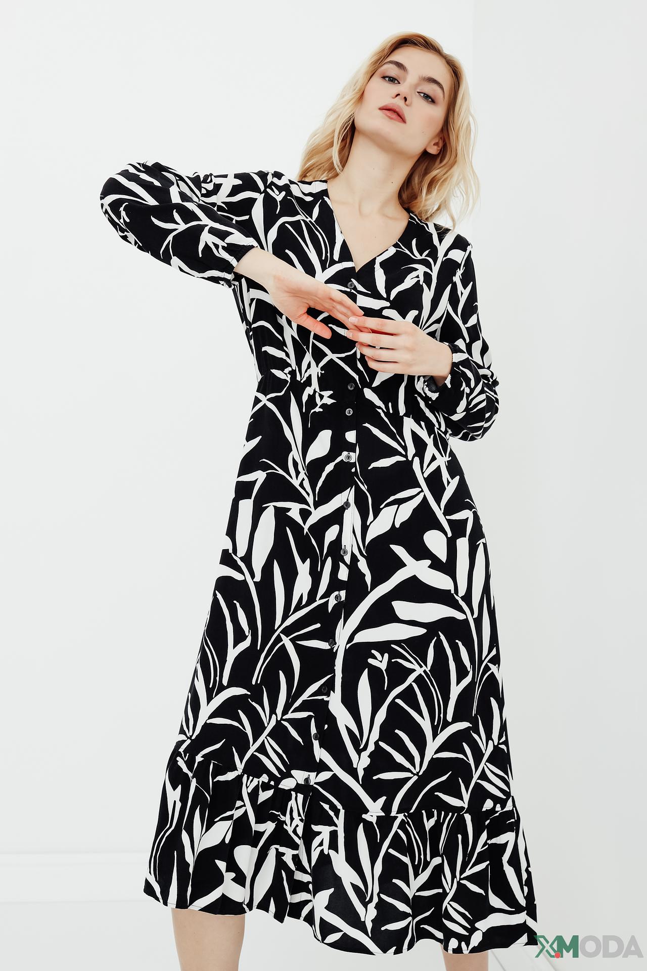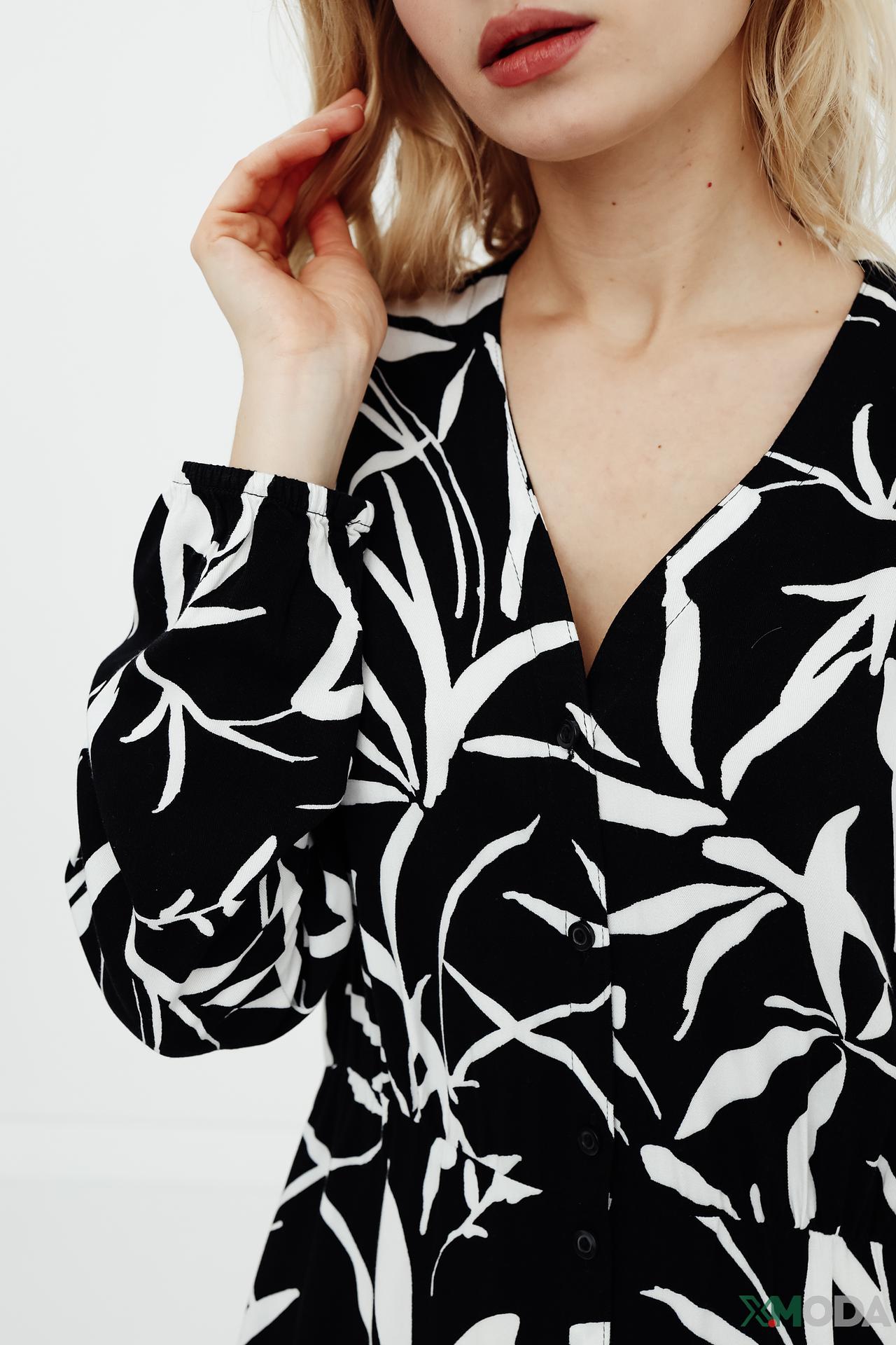 - Дизайн: Классический силуэт с V-образным вырезом и длинными рукавами. Оригинальный черно-белый принт в виде листьев делает платье ярким и запоминающимся.