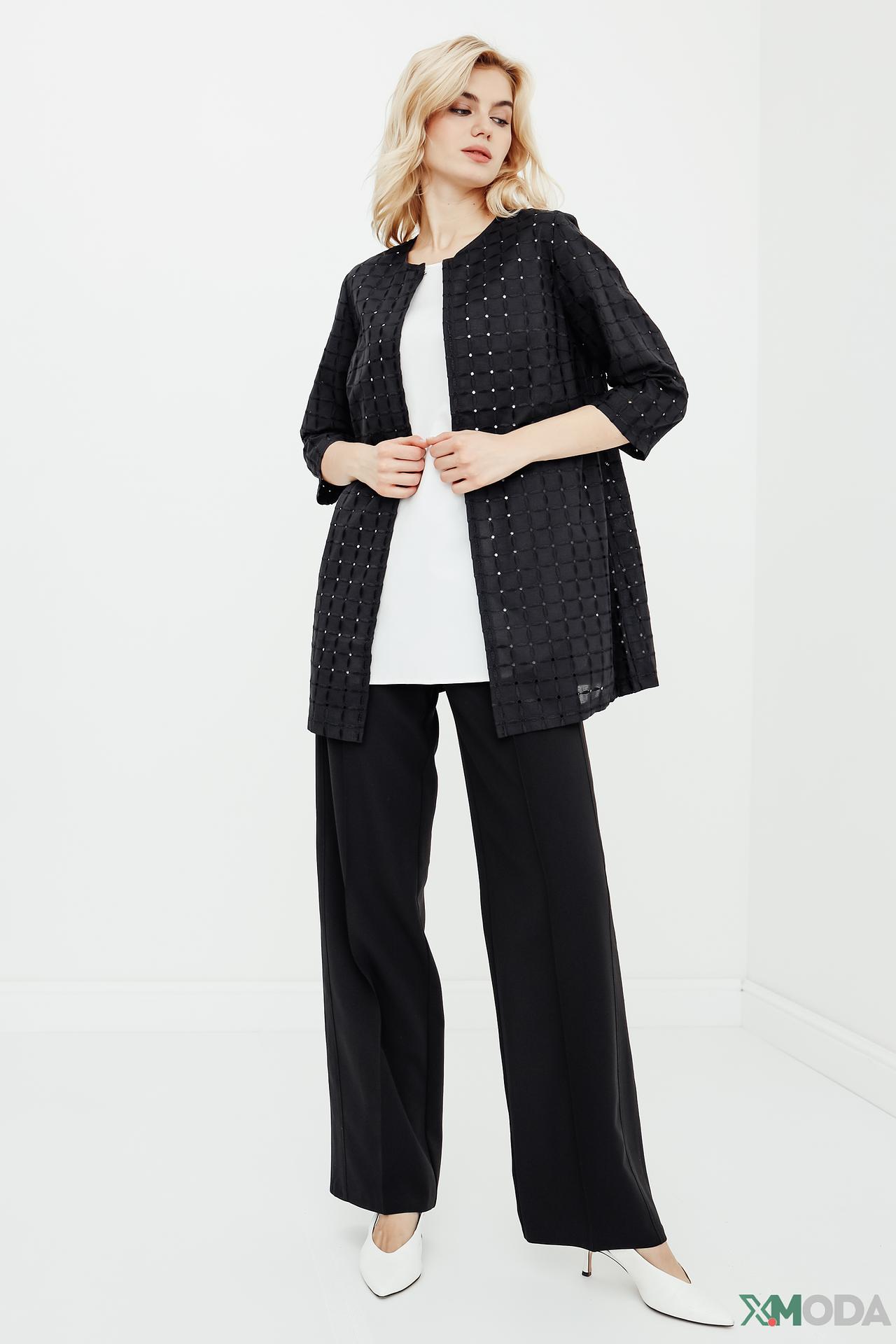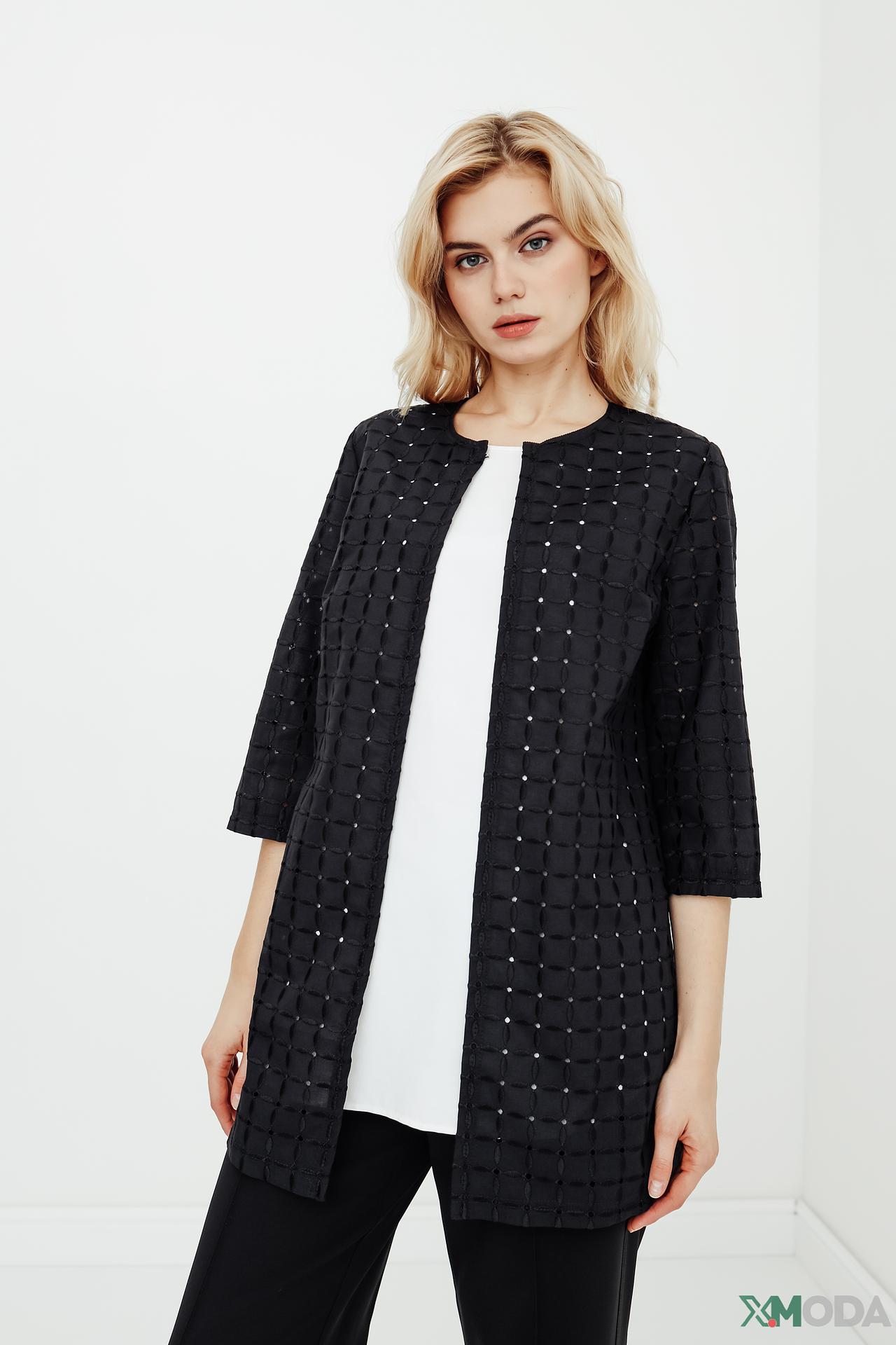 - Дизайн: Классический черный жакет с оригинальной фактурной отделкой и блестящими акцентами.