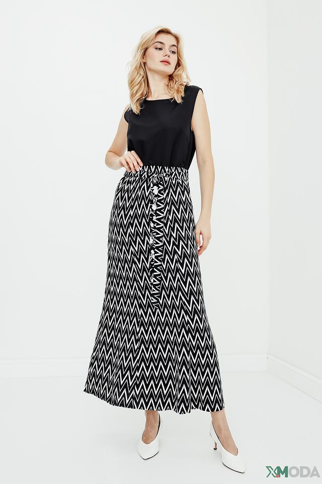 Юбка имеет завышенную талию, которая визуально удлиняет ноги и подчеркивает фигуру. Удобный пояс обеспечивает комфортную посадку. Модель выполнена из 100% вискозы, что делает её приятной на ощупь и обеспечивает хорошую воздухопроницаемость.