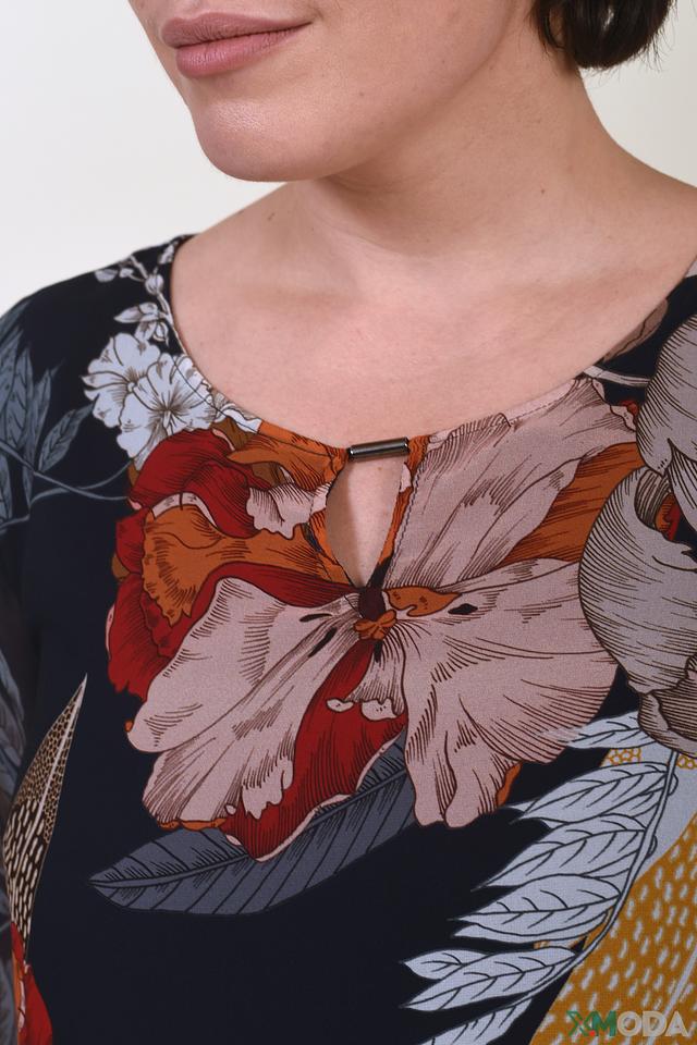Платье имеет прямой силуэт, длину до колена и рукава 3/4. Вырез горловины округлый, украшен небольшим вырезом с завязками. Основной цвет платья – черный, а его особенностью является яркий и красочный цветочный принт, включающий в себя различные оттенки коричневого, бежевого, оранжевого и голубого.
