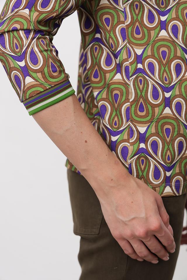 Особенностью модели является яркий и запоминающийся принт в геометрическом стиле, выполненный в сочетании зеленых, синих и коричневых оттенков. Лонгслив имеет круглый вырез горловины и длинные рукава.