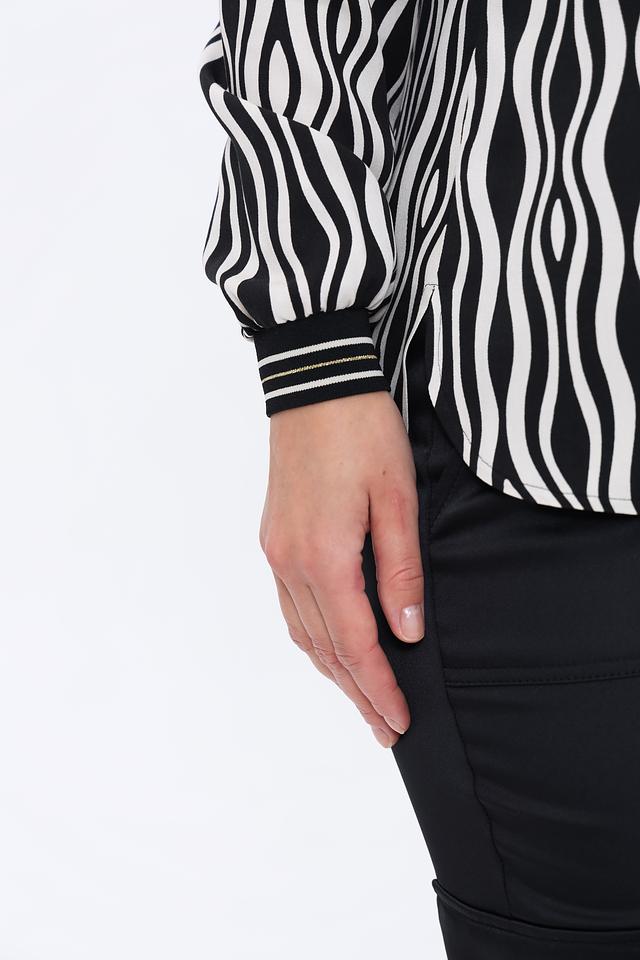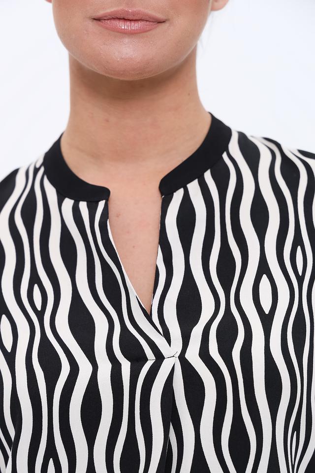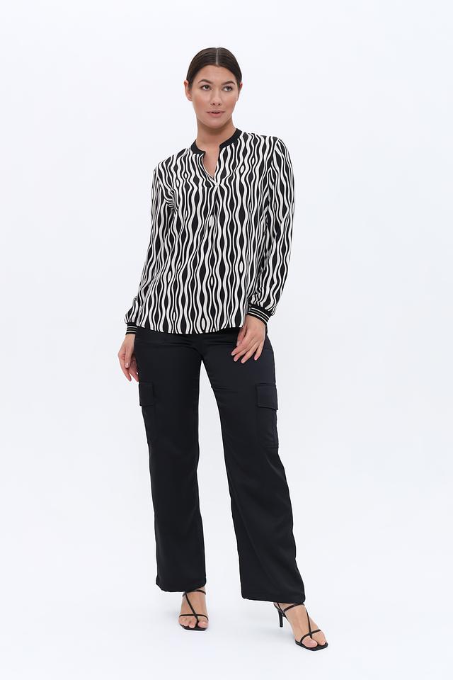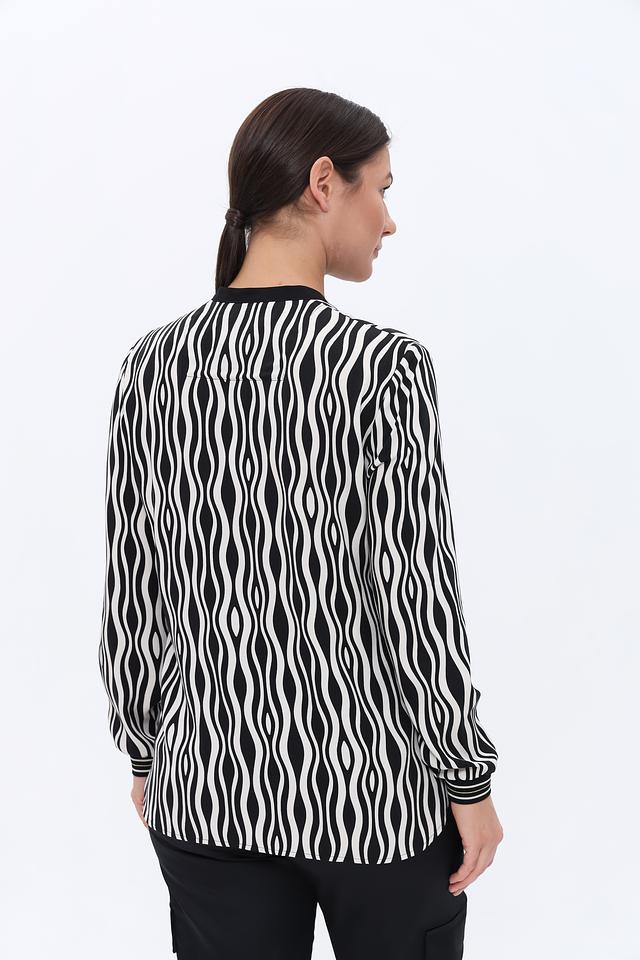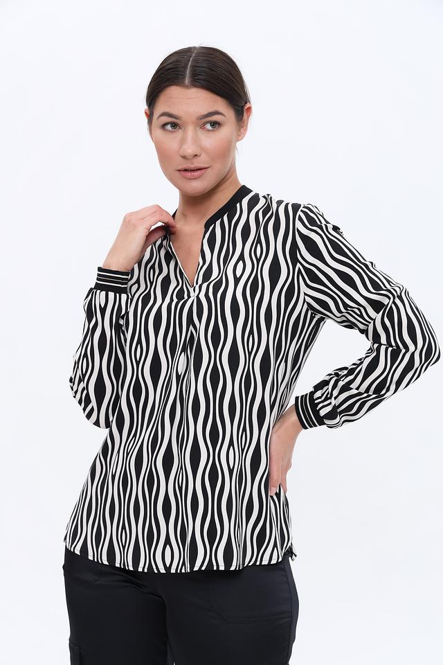 Блуза имеет длинные рукава и оригинальный волнистый принт в черно-белой гамме. Небольшой вырез горловины придает образу элегантность и женственность.