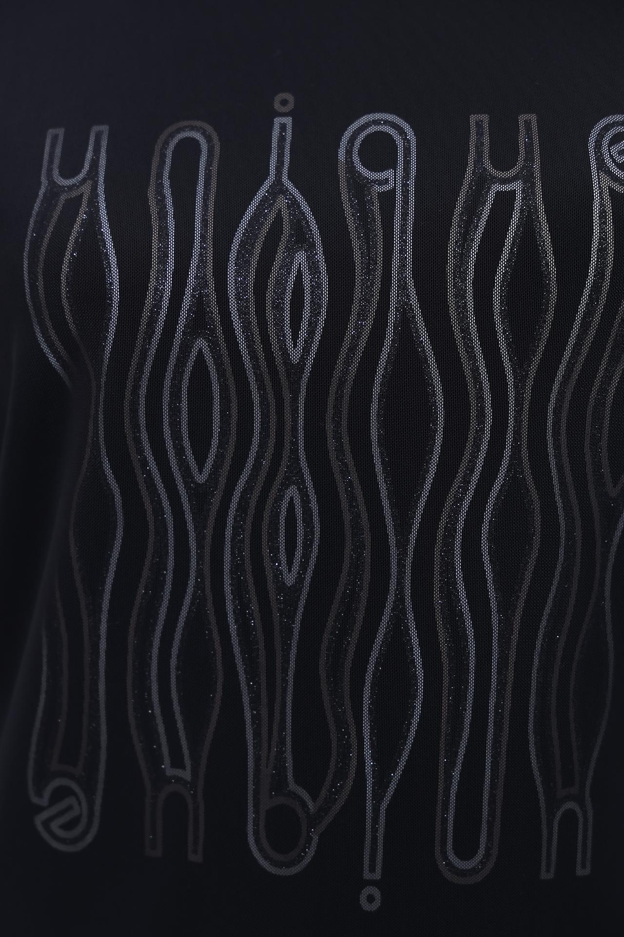 - Дизайн: Классический круглый вырез горловины и длинные рукава создают лаконичный силуэт. Оригинальный серебристый принт, расположенный на груди, добавляет изысканности и привлекает внимание.
