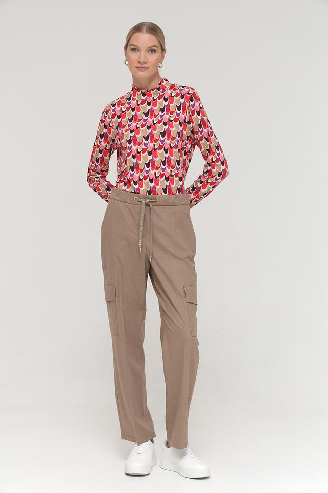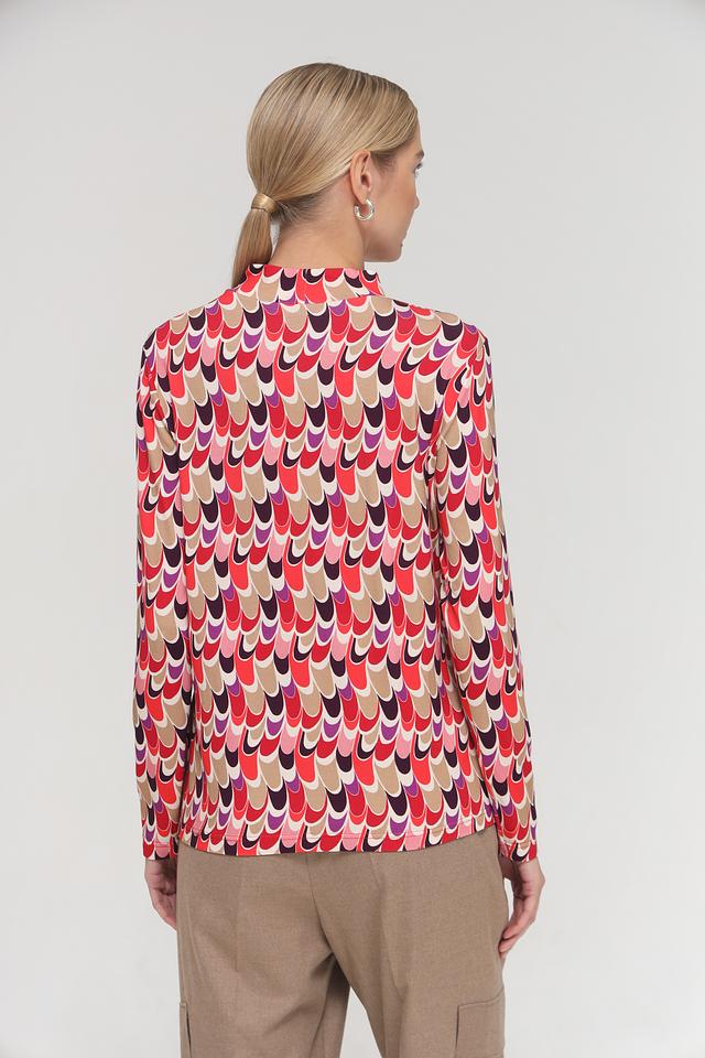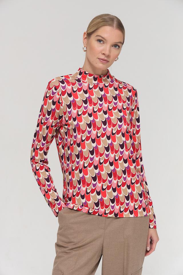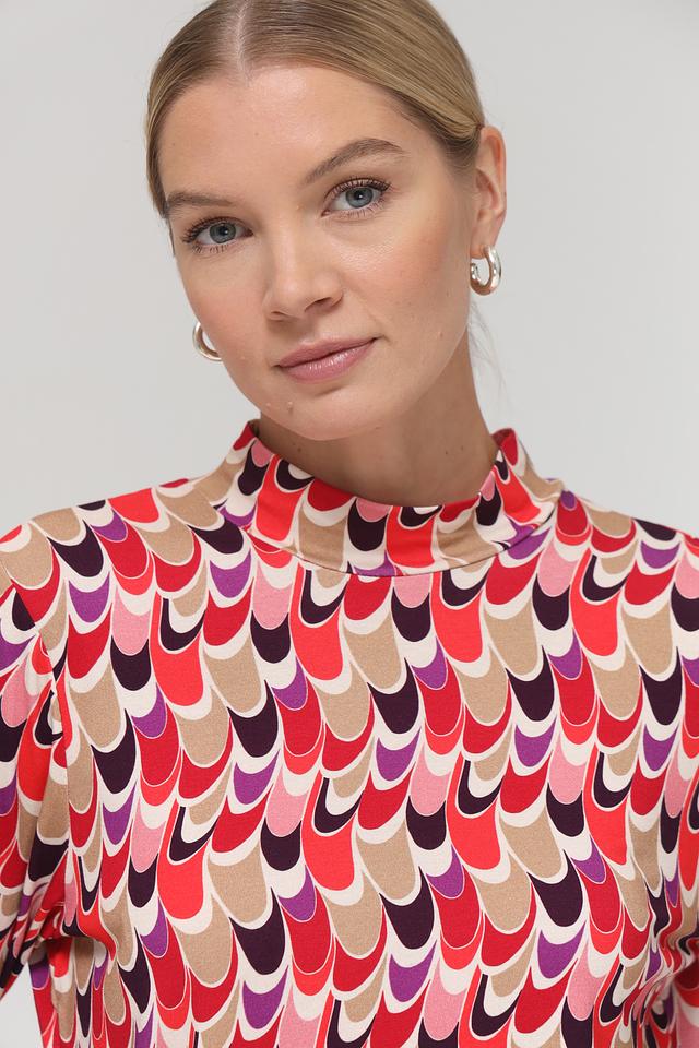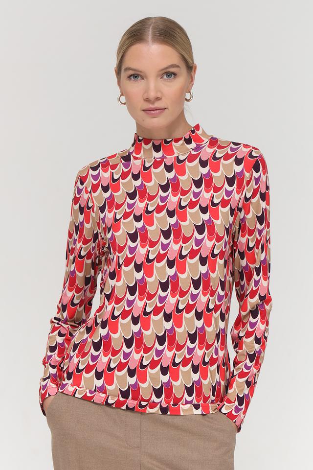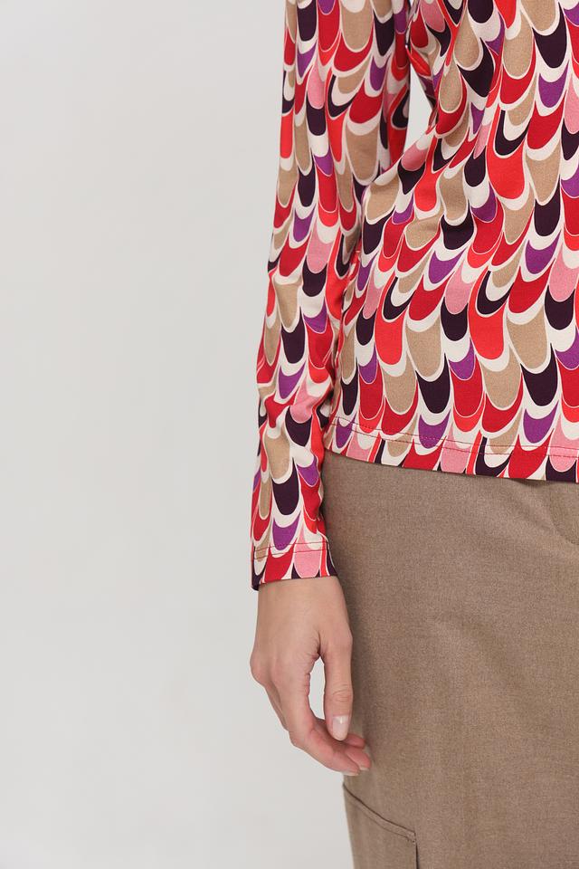 Особенностью данной водолазки является её яркий и оригинальный принт, выполненный в виде абстрактных узоров. Сочетание различных оттенков красного, розового, коричневого и фиолетового создаёт эффектный и запоминающийся образ.