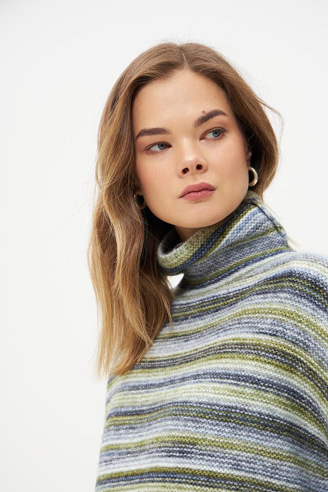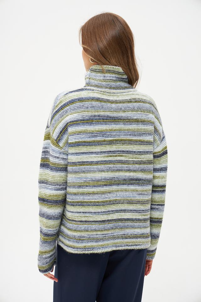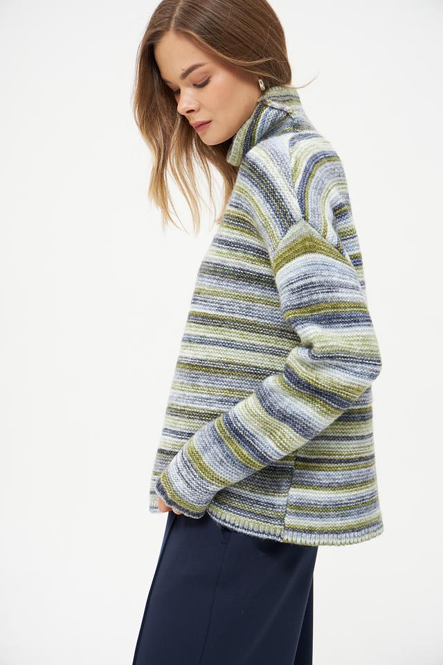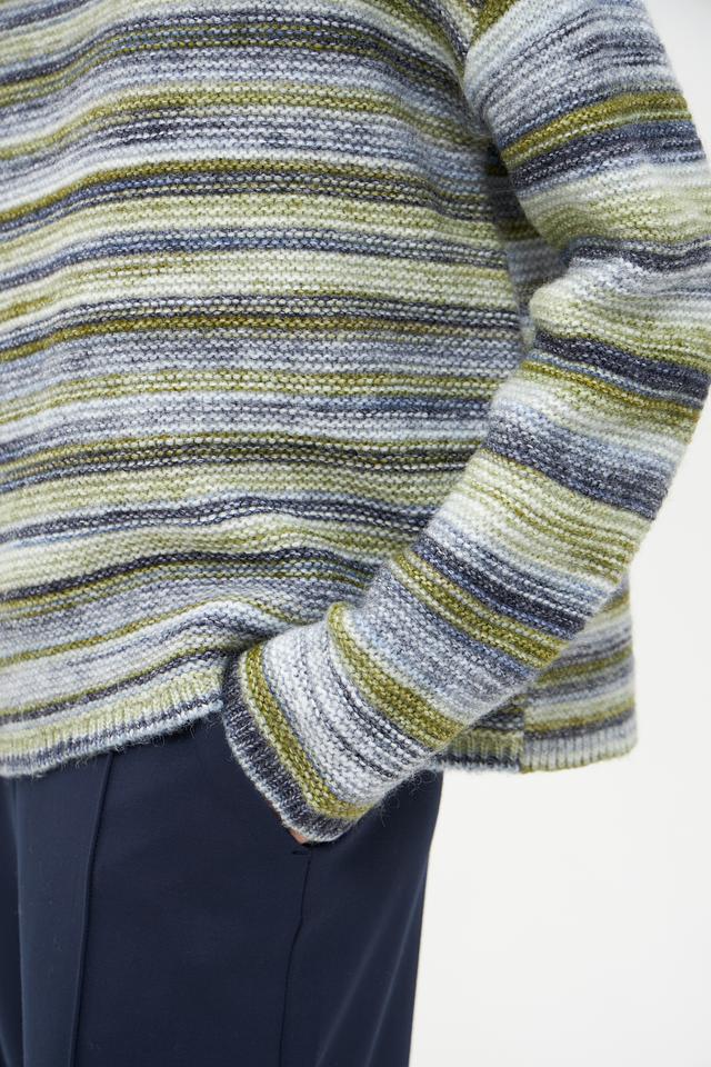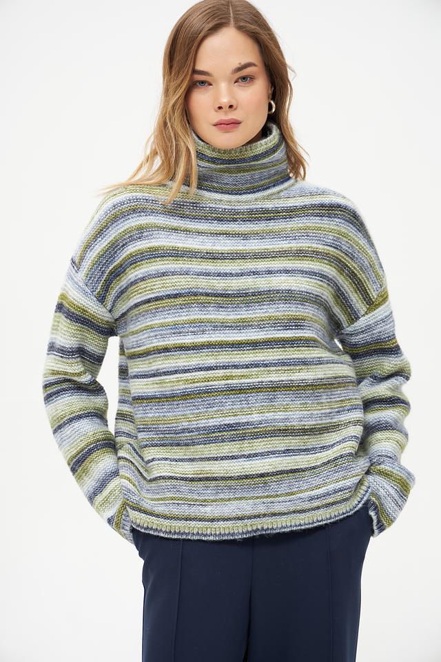 Женский пуловер Bianca в полоску серого, зеленого и синего цветов. Изготовлен из мягкой смеси полиэстера, акрила, полиамида и шерсти, обеспечивающей комфорт и тепло. Состав: полиэстер 47%, полиакрил 39%, полиамид 8%, шерсть 6%