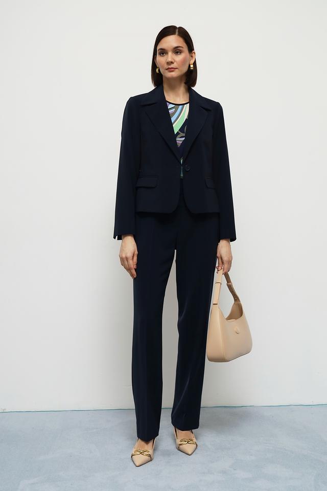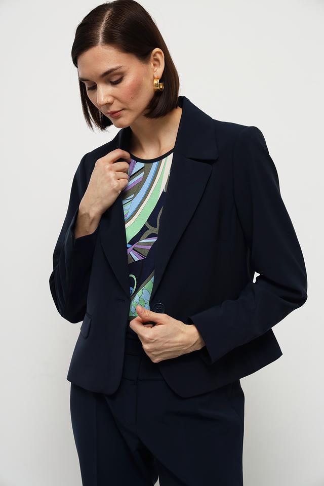 Этот стильный жакет от Bianca выполнен в классическом тёмно-синем цвете. Прямой крой и приталенный силуэт подчеркивают фигуру, создавая элегантный образ.