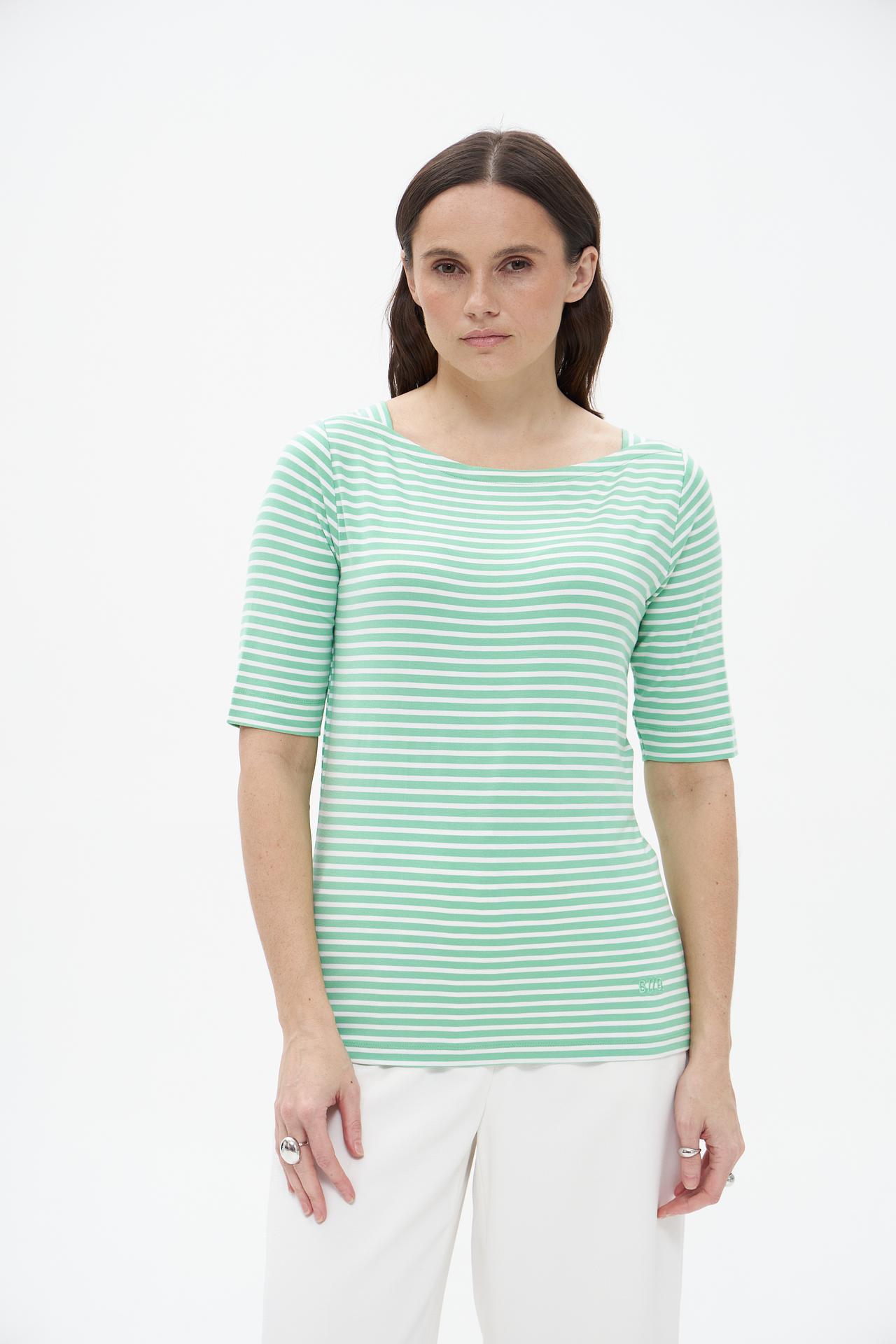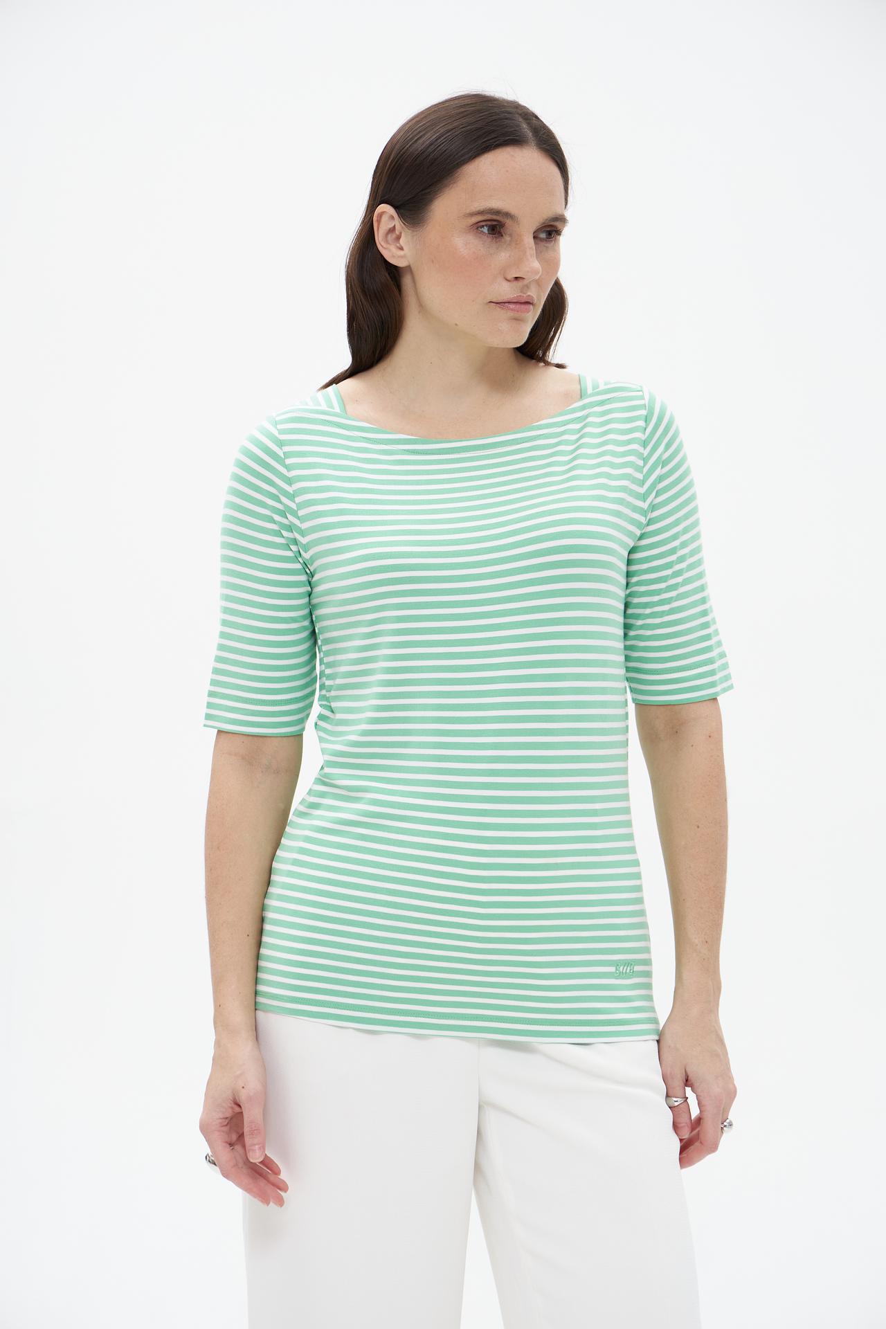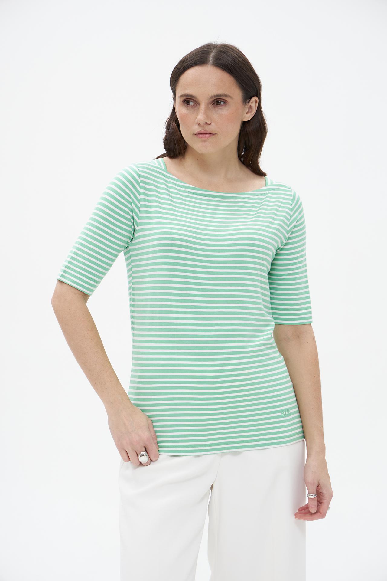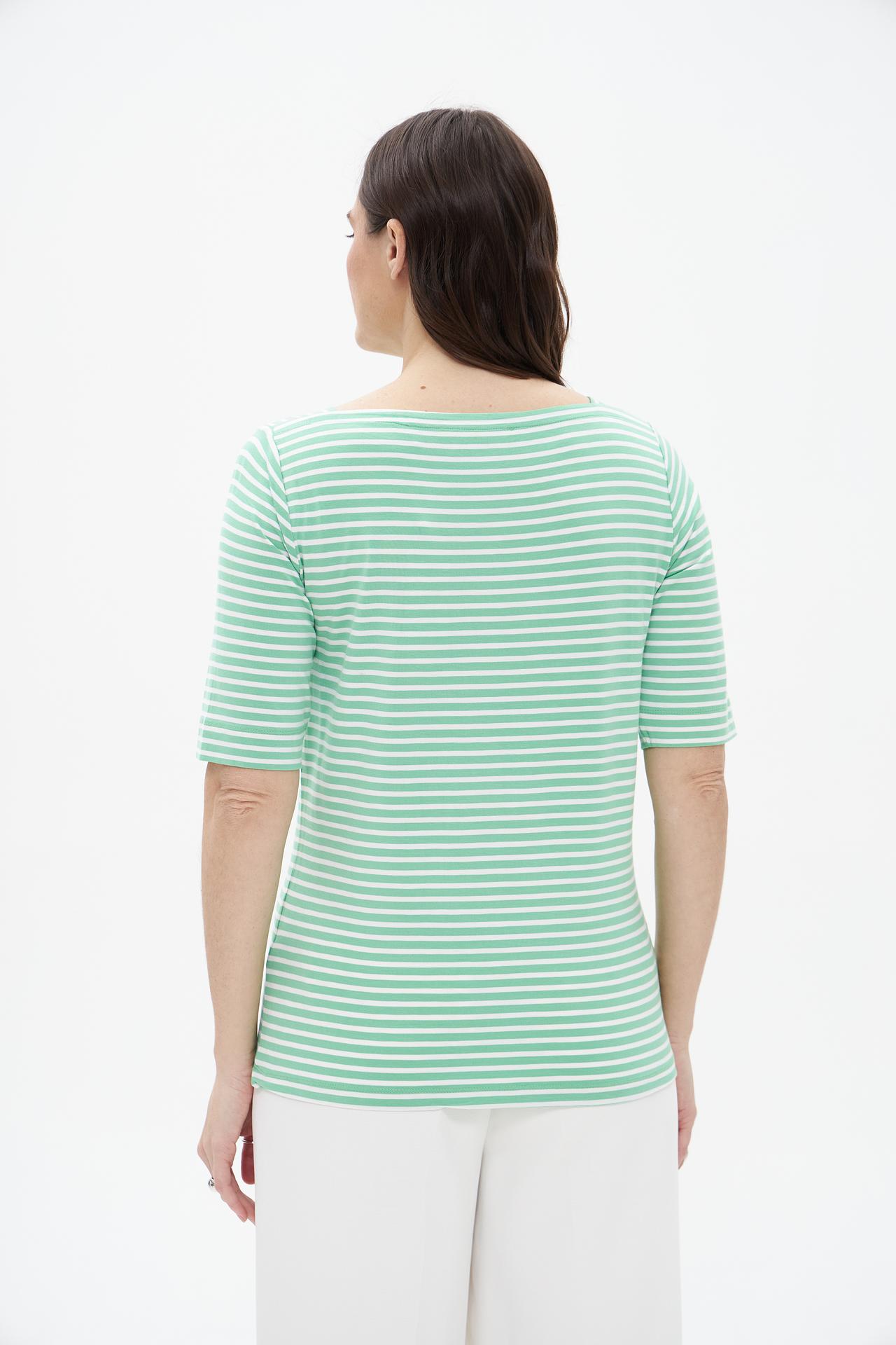 Классический дизайн в полоску делает эту футболку универсальным элементом гардероба. Она легко сочетается с джинсами, юбками и шортами, позволяя создавать разнообразные и актуальные образы на каждый день.