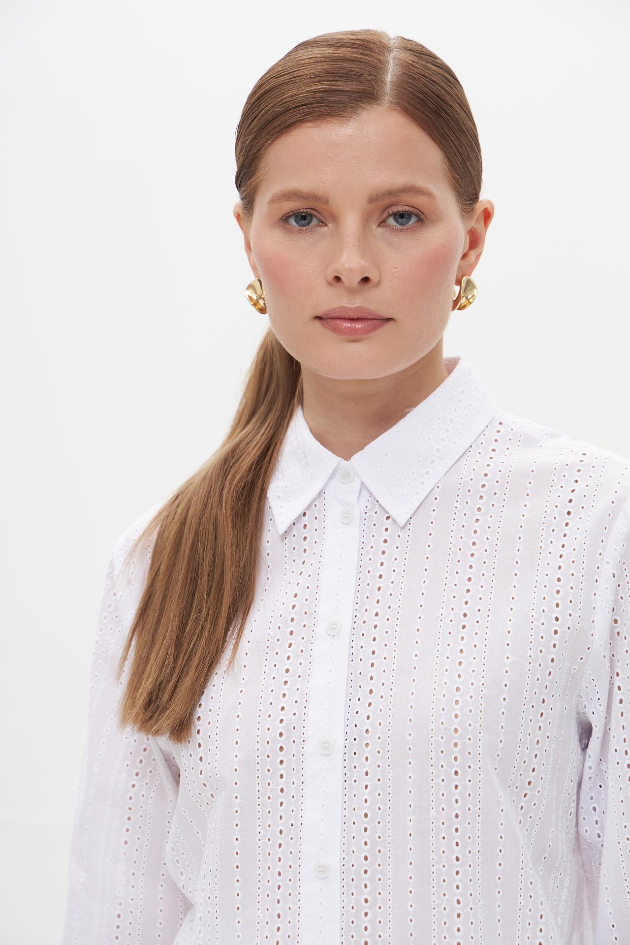 Изысканная белая блуза Bianca, выполненная из 100% хлопка, станет незаменимой вещью в вашем гардеробе. Эта блуза сочетает в себе комфорт натуральной ткани и элегантность классического кроя, что делает ее идеальной для любого случая – от деловых встреч до повседневных прогулок. Легкая и дышащая ткань обеспечит вам комфорт в течение всего дня.