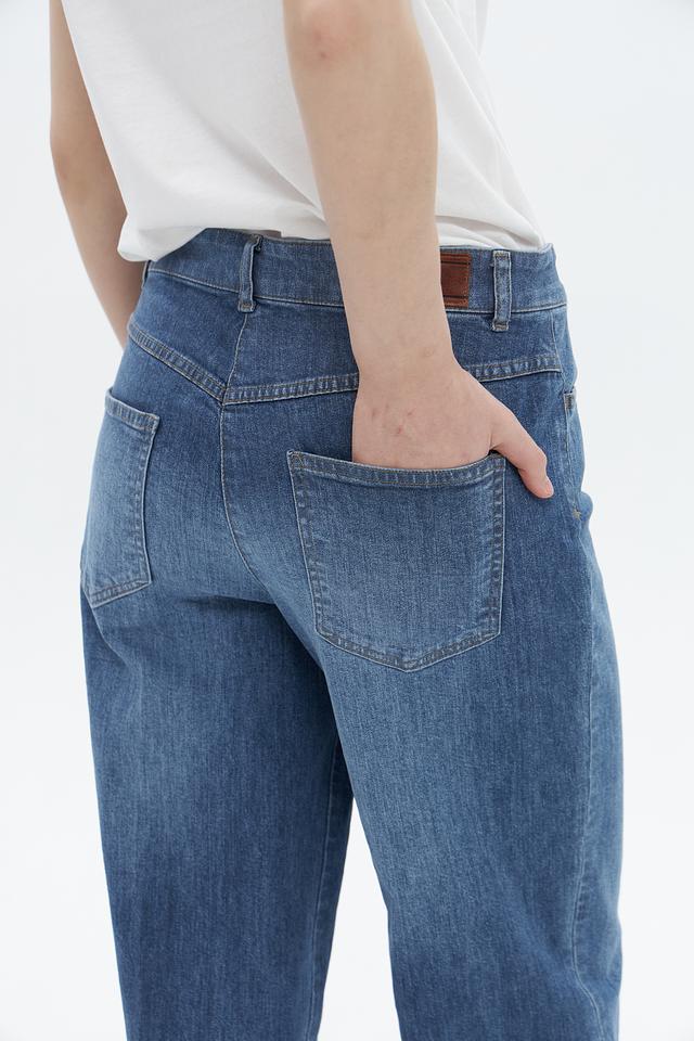 Джинсы имеют классический синий цвет и универсальный дизайн, который легко сочетается с различными элементами гардероба. Прямой крой и высокая посадка подчеркивают фигуру и создают элегантный силуэт.