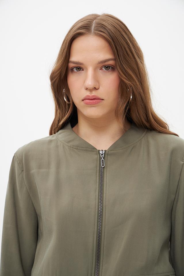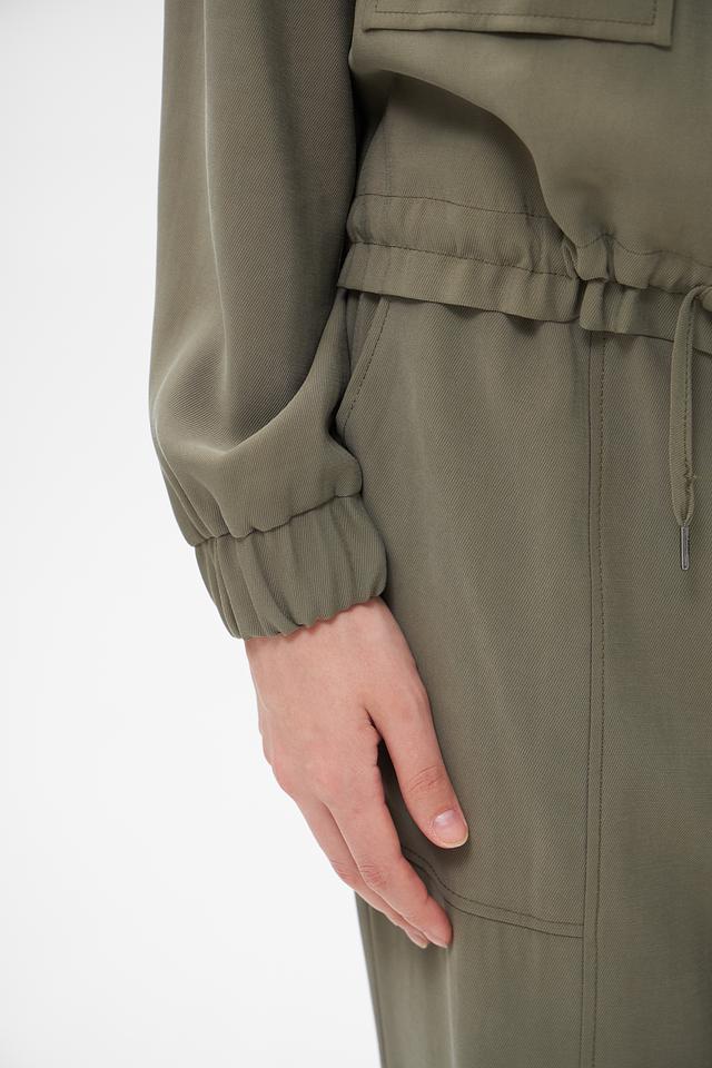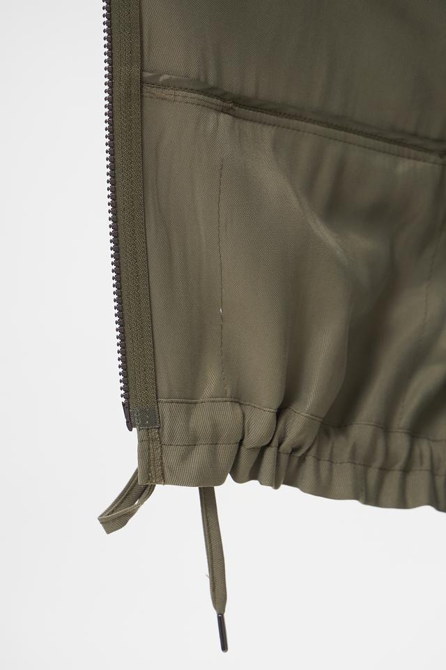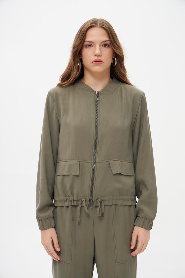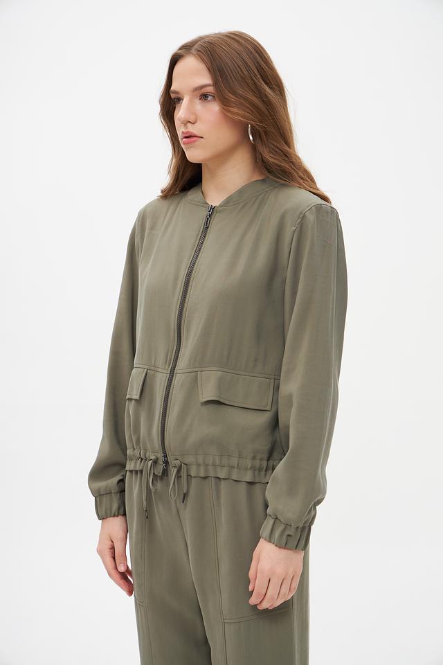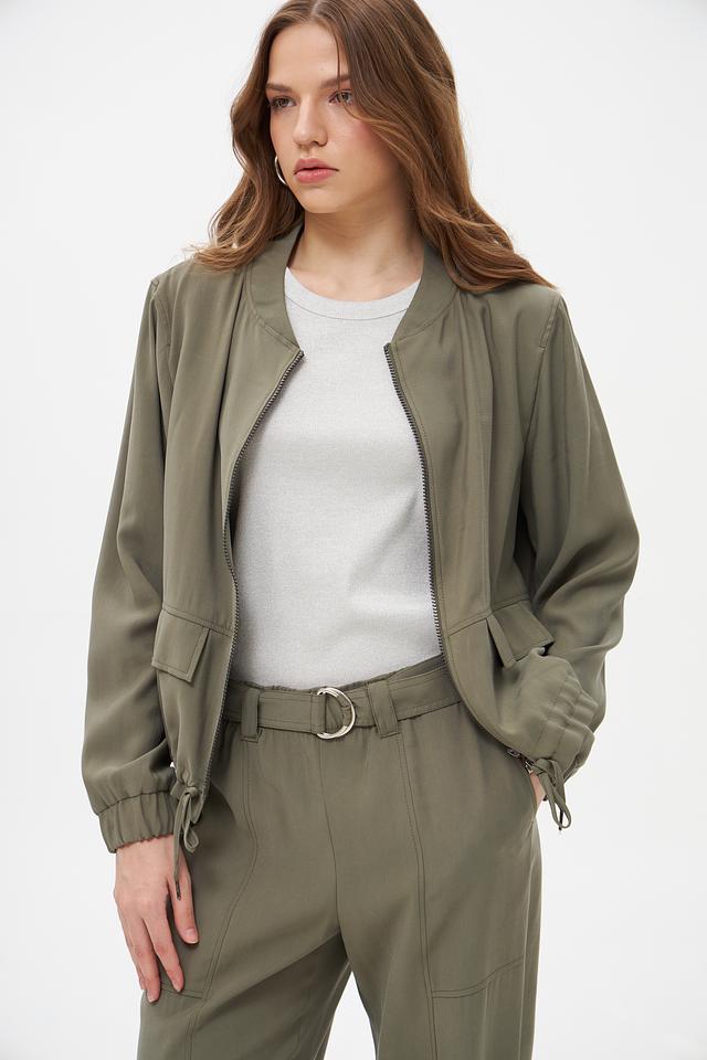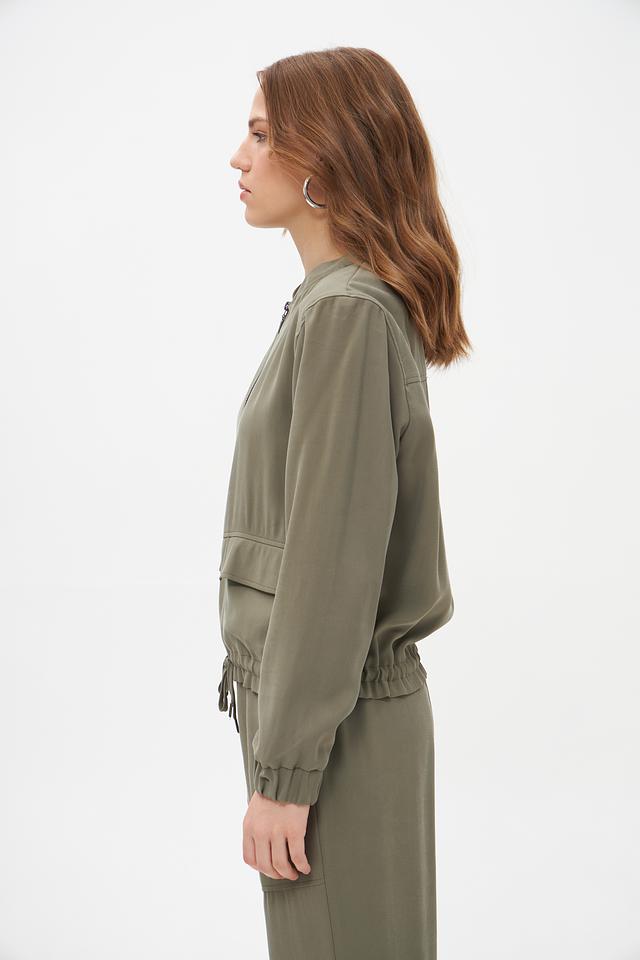 Модель имеет укороченный крой, застежку на молнию и два функциональных кармана. Сборка по низу и регулируемые манжеты с помощью шнурков придают жакету более динамичный и современный вид. Жакет идеально подходит для создания повседневных образов, а также для более стильных и смелых решений.