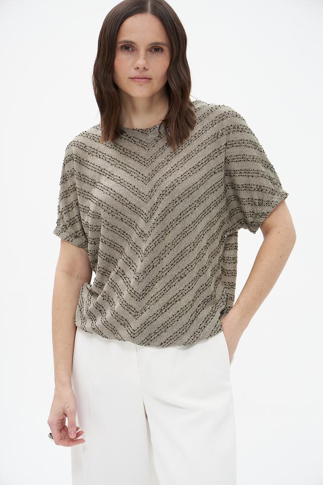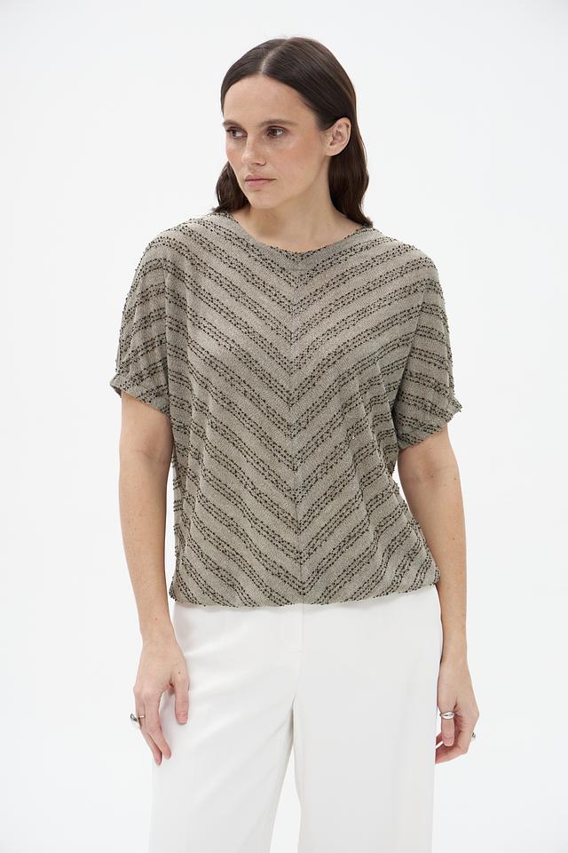 Эта футболка от Bianca станет отличным дополнением к вашему гардеробу. Она выполнена в бежевом цвете и украшена выразительным геометрическим узором, который придает ей особый шарм.
