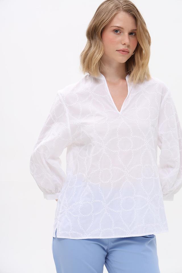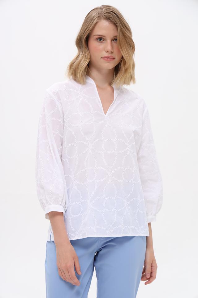 Белая блуза Bianca с изысканной вышивкой в виде геометрического узора станет отличным дополнением к вашему гардеробу. Модель выполнена из 100% хлопка, что обеспечивает комфорт и воздухопроницаемость. Состав: хлопок 100%