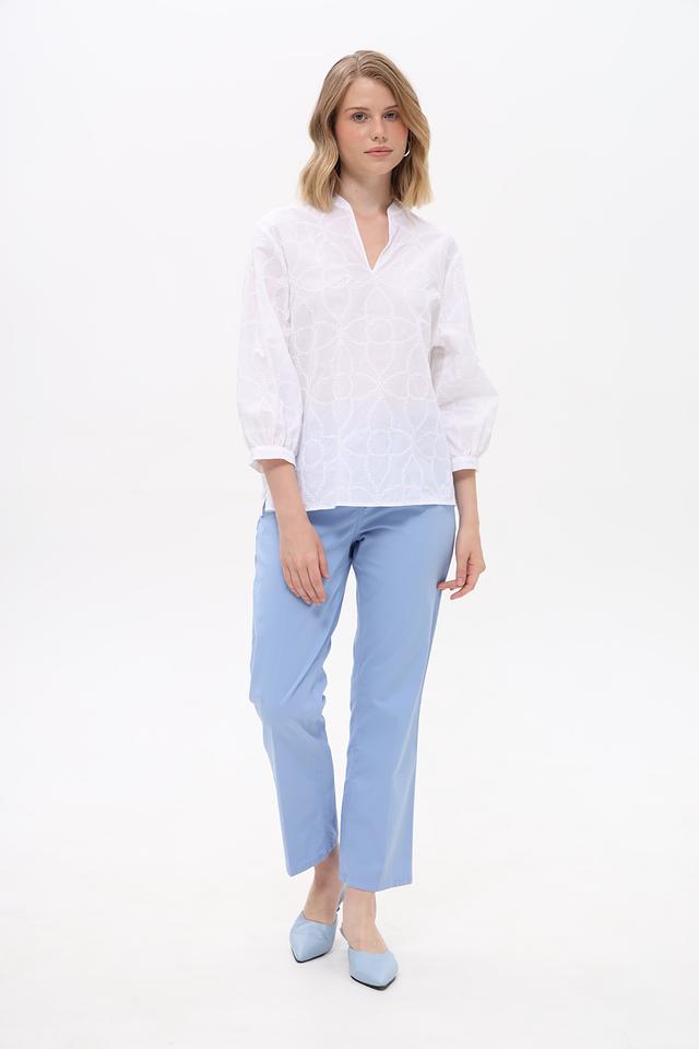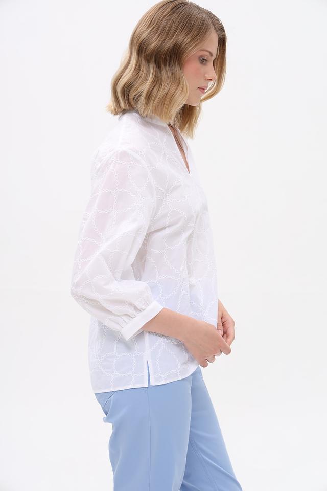 Особенностью данной модели является изысканная вышивка, выполненная в виде геометрического узора. Вышивка придает блузе элегантный и утонченный вид. Блуза имеет V-образный вырез горловины и рукава 3/4 с небольшими сборками на манжетах, что придает им объем и воздушность.