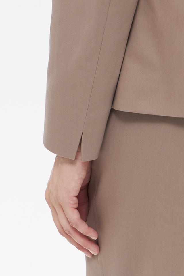 Жакет имеет классический отложной воротник и застегивается на одну пуговицу. Длинные рукава и аккуратные карманы добавляют ему функциональности.
