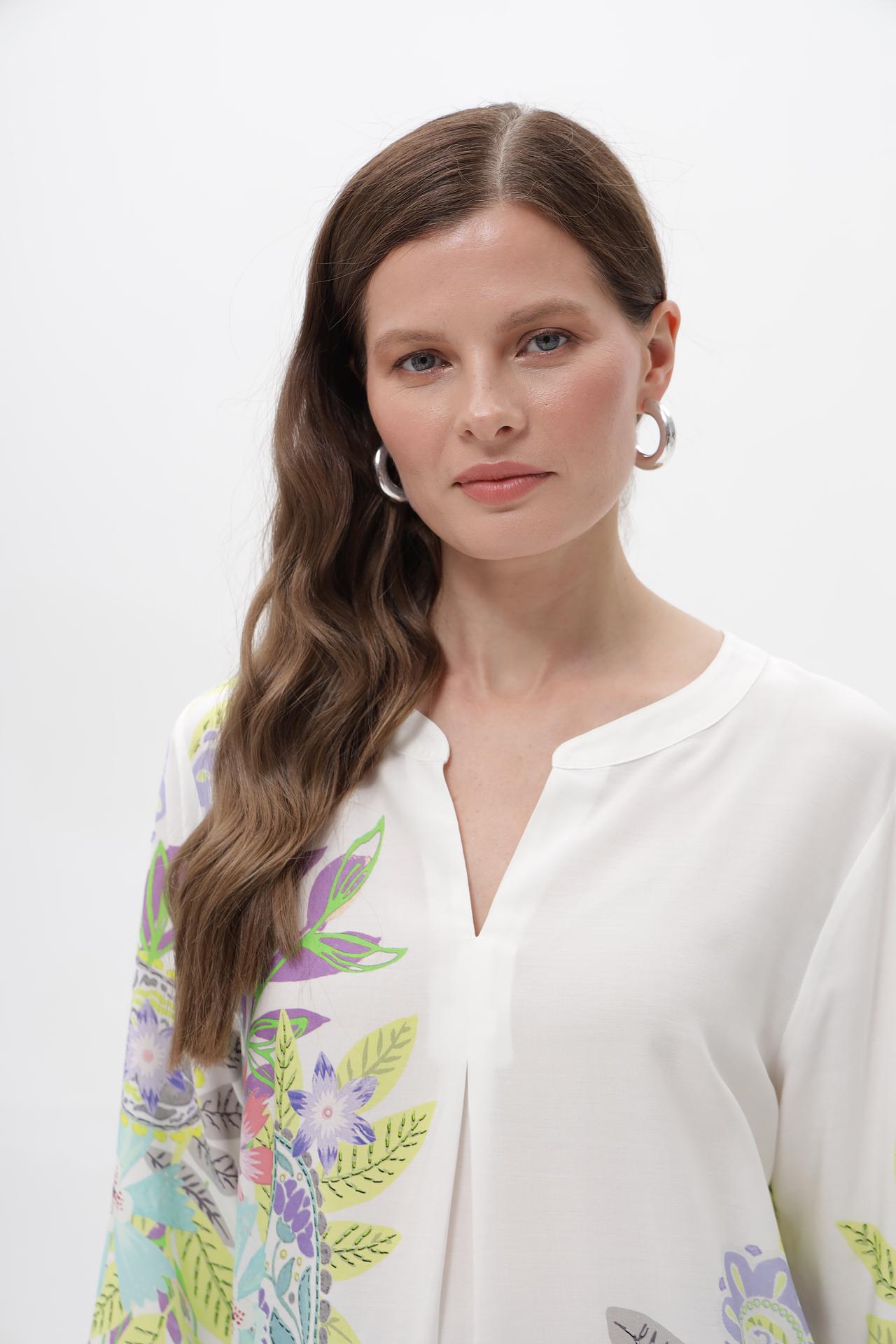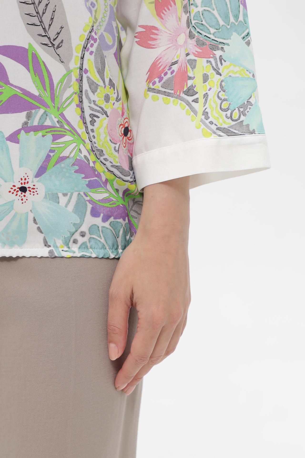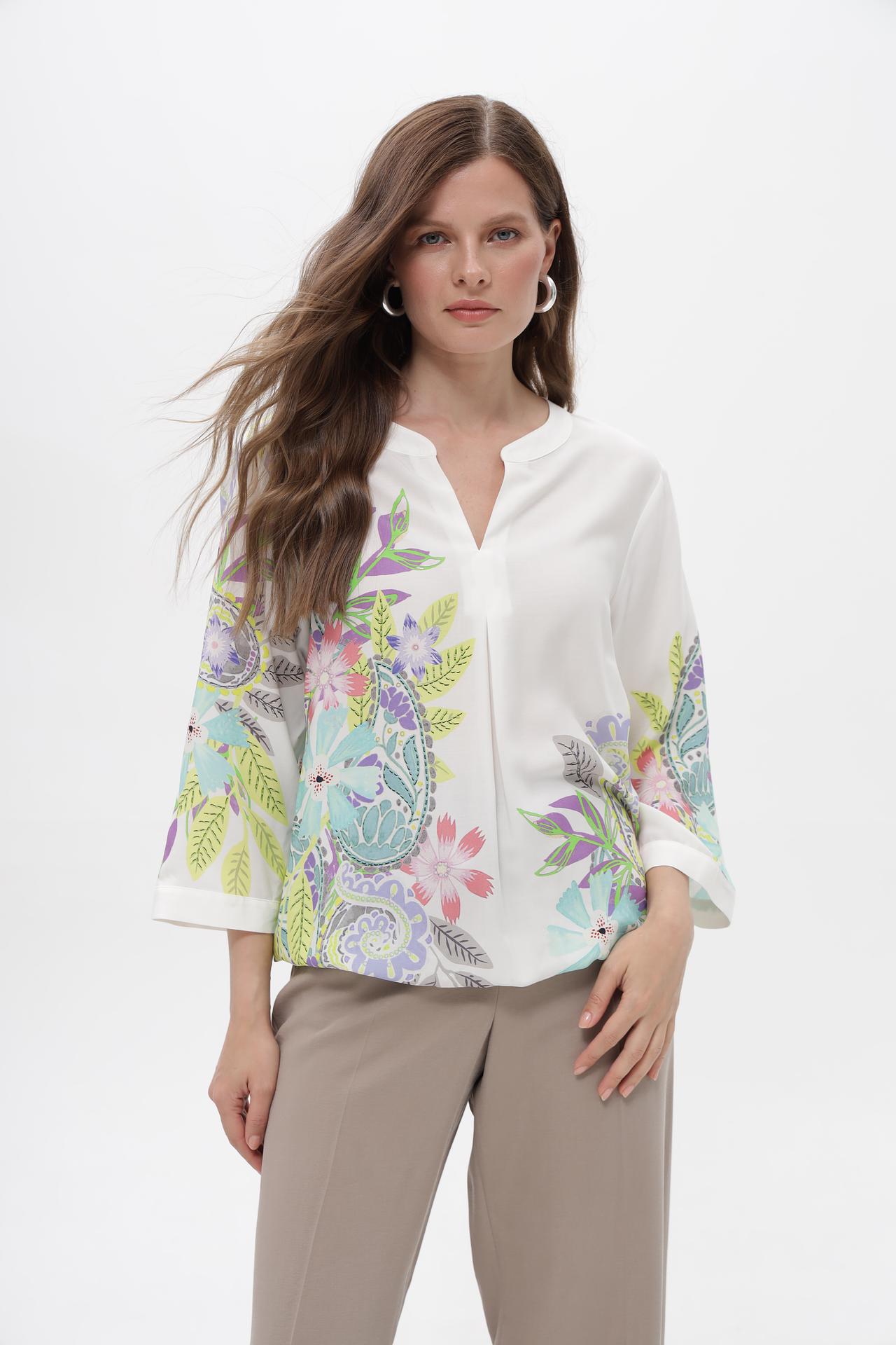 Легкая женская блуза Bianca из 100% вискозы — идеальное решение для вашего весеннего и летнего гардероба. Эта дышащая ткань обеспечивает максимальный комфорт даже в теплую погоду. Элегантная блузка выполнена в свободном крое, что гарантирует свободу движений и превосходную посадку на любую фигуру. Основной белый цвет служит прекрасным фоном для яркого и выразительного цветочного принта с элементами пейсли, расположенного по бокам и на рукавах.