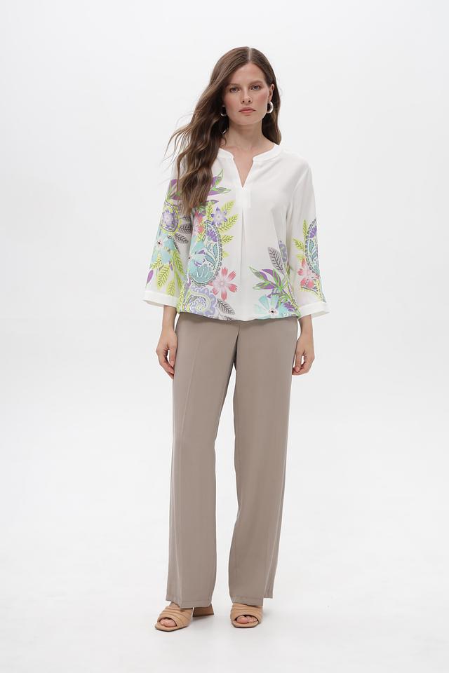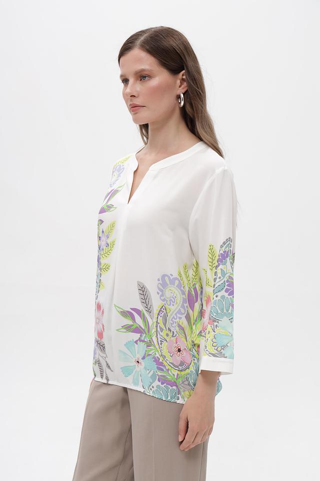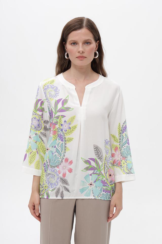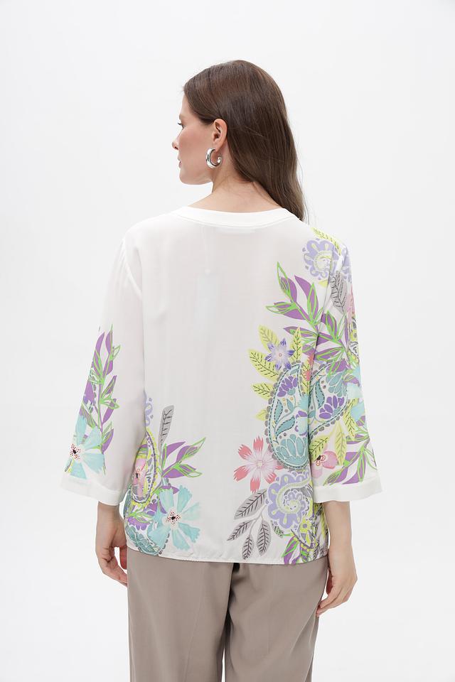 Белая блузка Bianca с ярким цветочным принтом, выполненная из 100% вискозы. Модель с V-образным вырезом и рукавами 3/4, идеально подходит для создания лёгкого и женственного образа. Состав: вискоза 100%