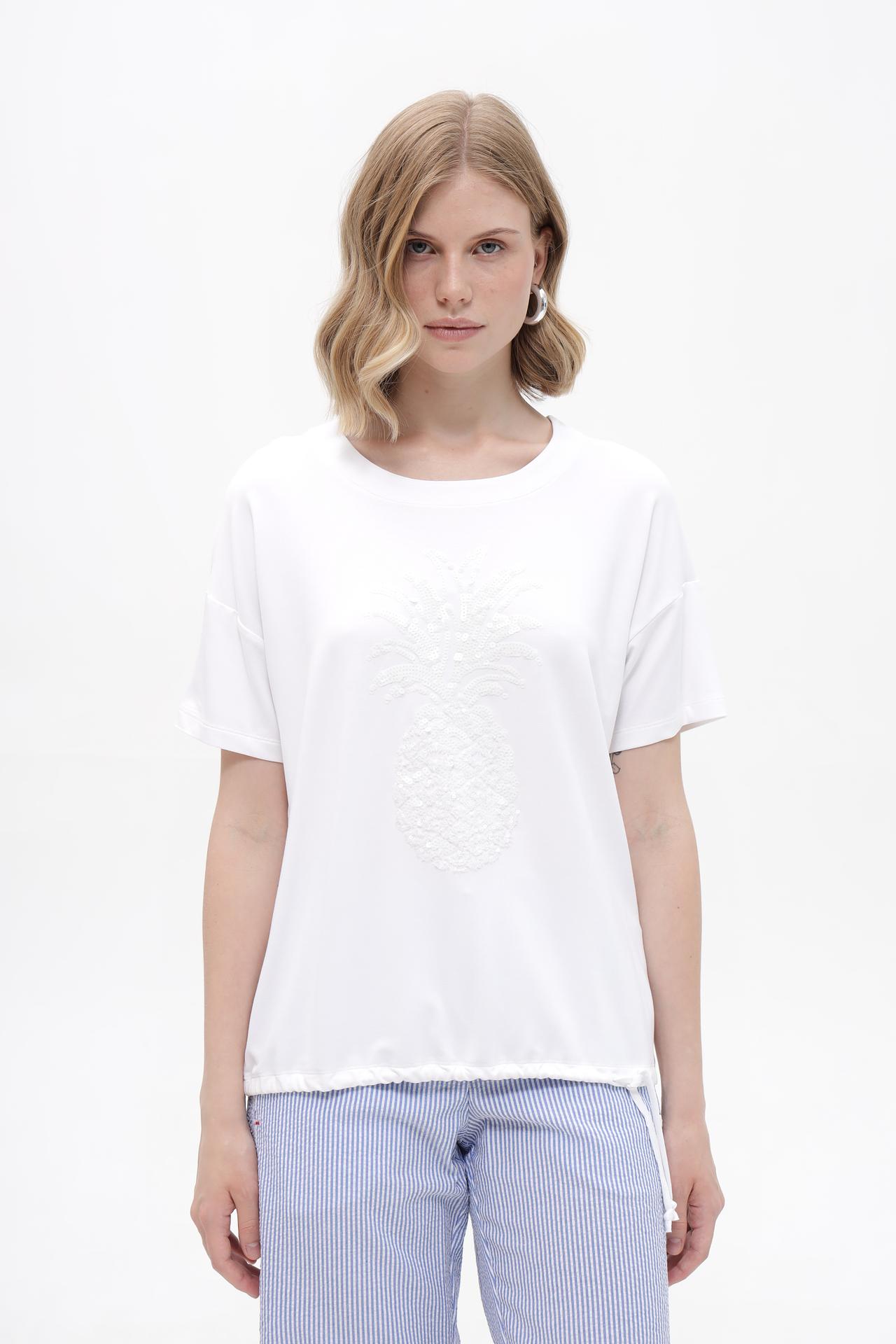 Футболка украшена изящной вышивкой в виде ананаса, выполненной из мелких пайеток. Этот декоративный элемент придает изделию особый шарм и актуальность, делая его заметным акцентом в вашем гардеробе. Приятная на ощупь ткань и лаконичный дизайн делают эту футболку универсальной основой для множества комбинаций.