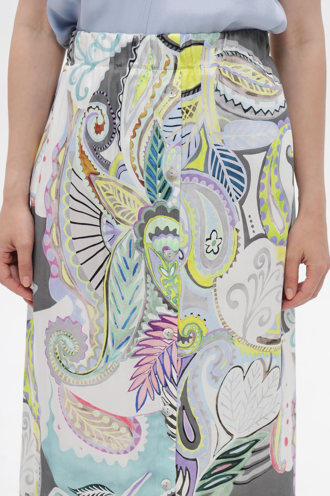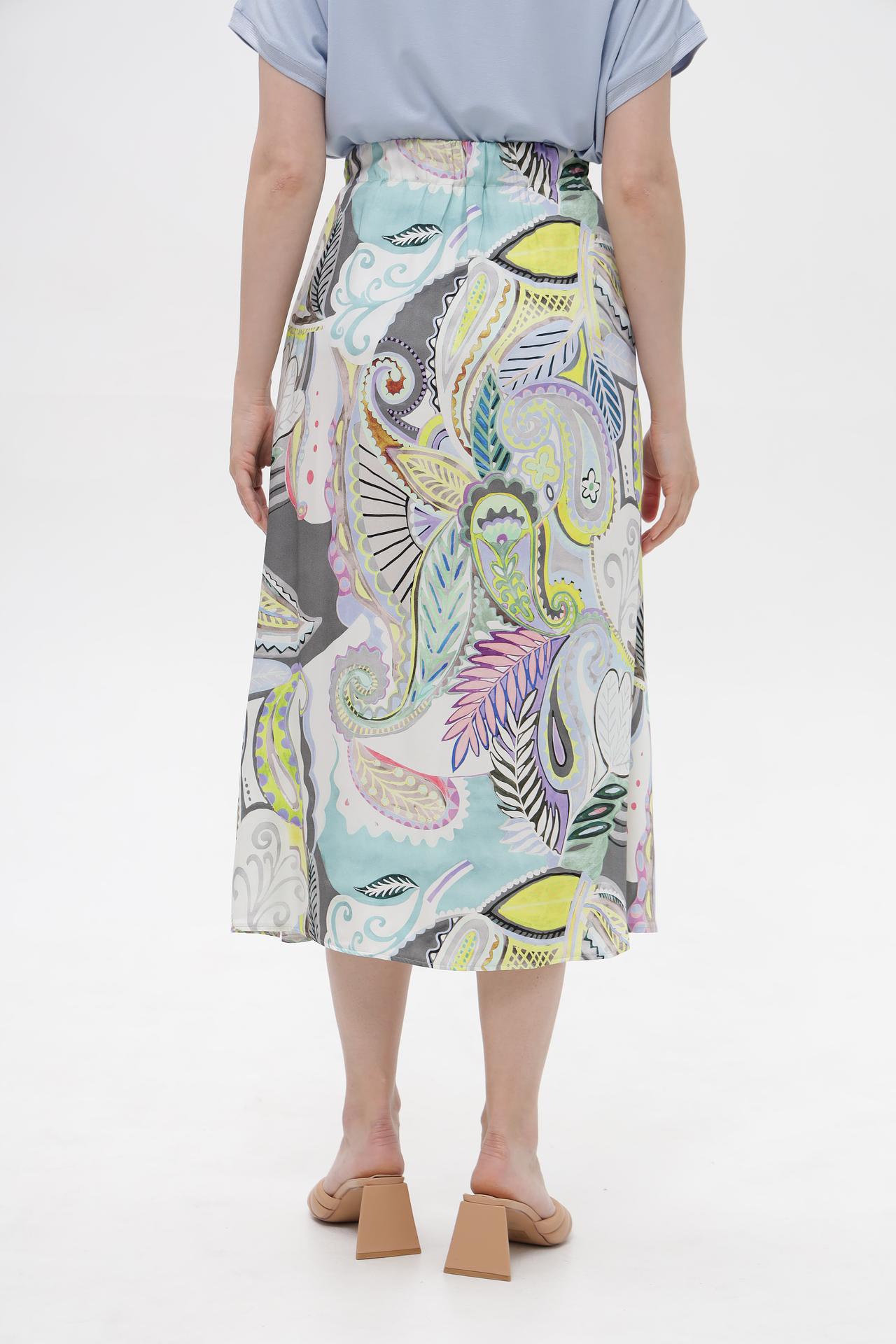 Модель представляет собой миди-юбку с оригинальным принтом, который привлекает внимание и добавляет образу индивидуальность. Юбка подходит для создания как повседневных, так и более нарядных образов.