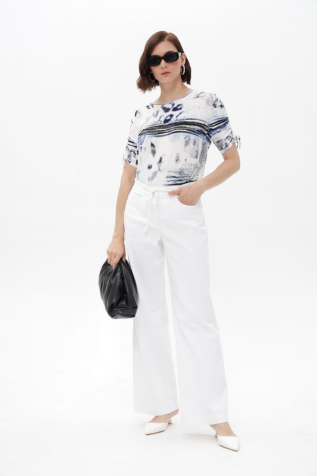 Брюки имеют завышенную талию и пояс с функциональной кулиской, позволяющей регулировать облегание по фигуре. Классический крой клеш визуально удлиняет ноги и подчеркивает женственность силуэта.