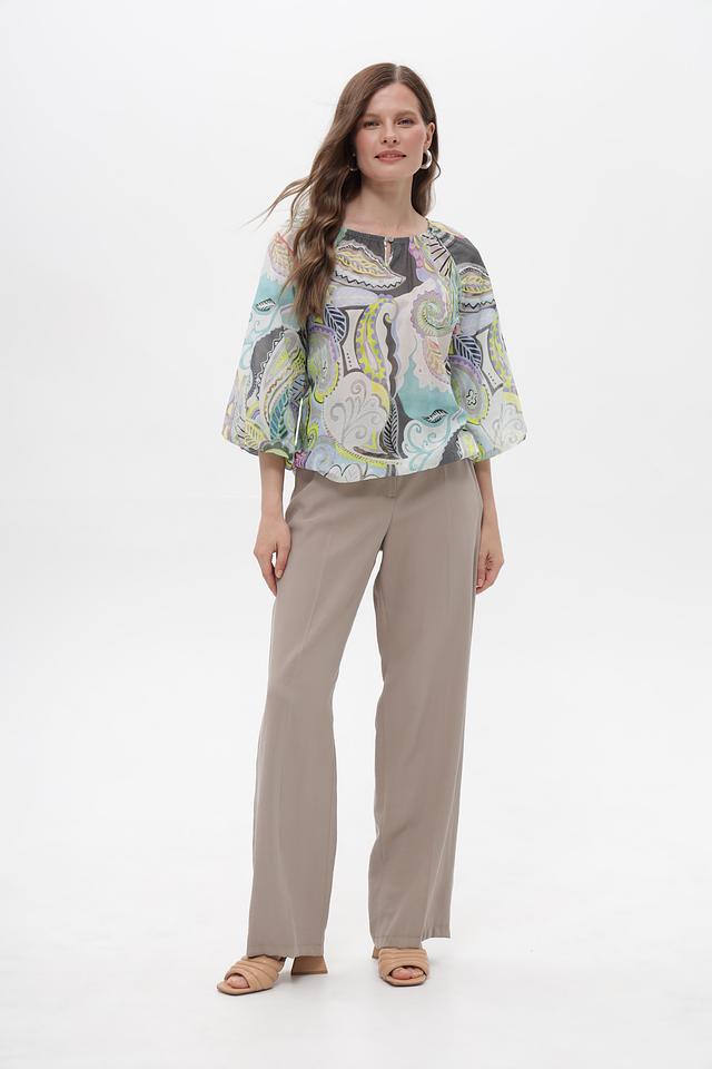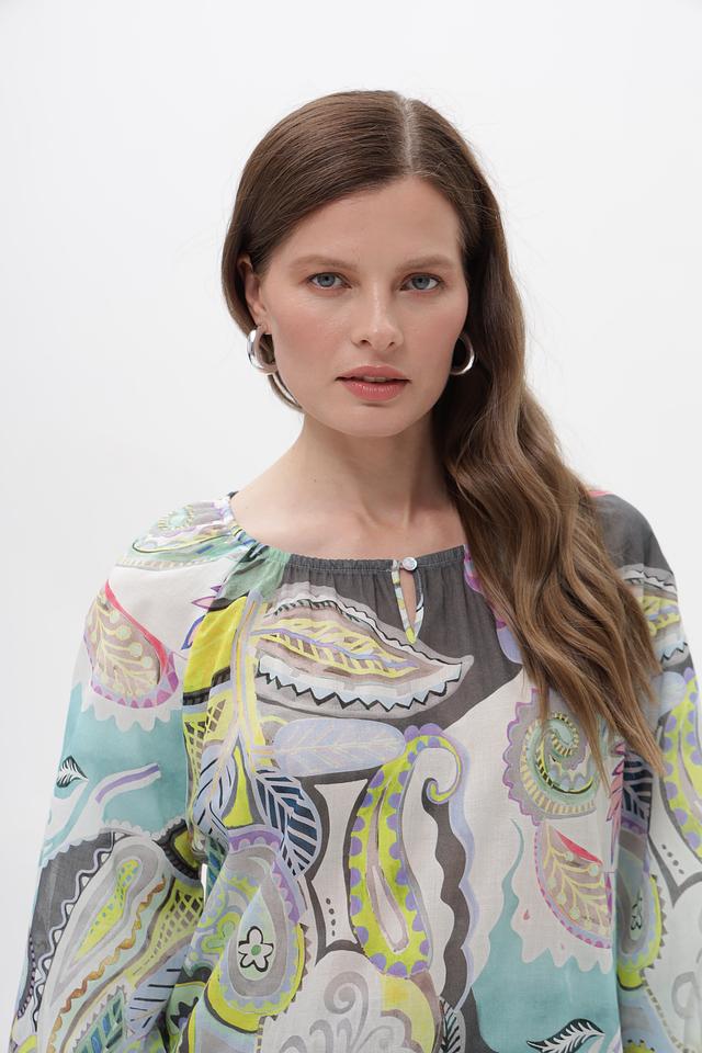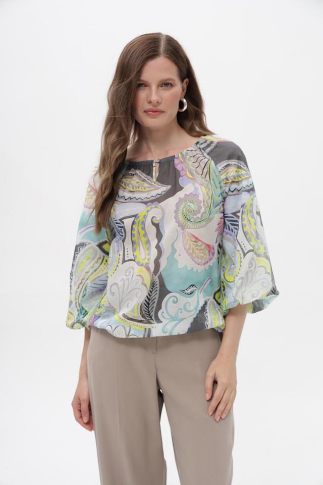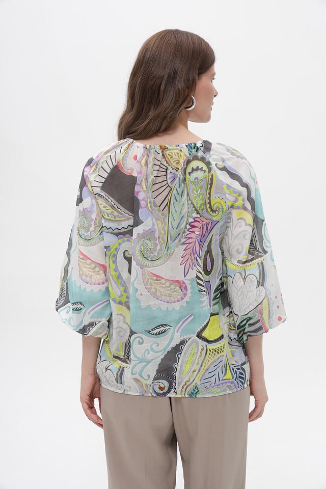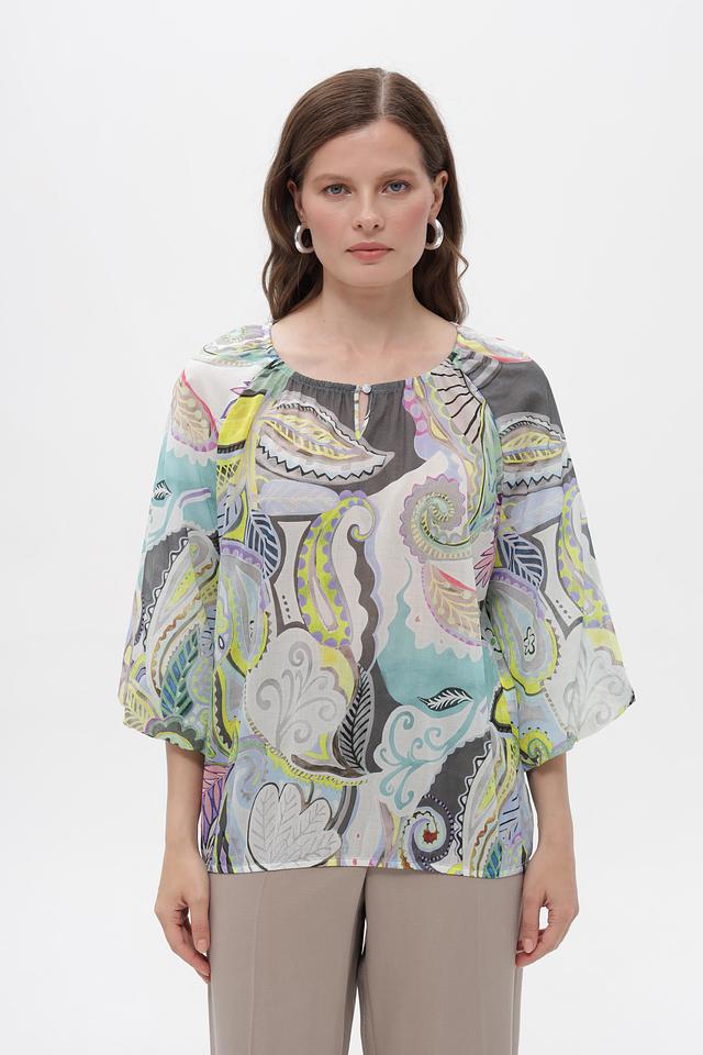Модель имеет свободный крой, который не сковывает движения, и рукава длиной 3/4. Особенность блузки – эффектный принт пейсли в мятной, серой, зелёной, жёлтой и розовой цветовой гамме. Круглый вырез горловины.