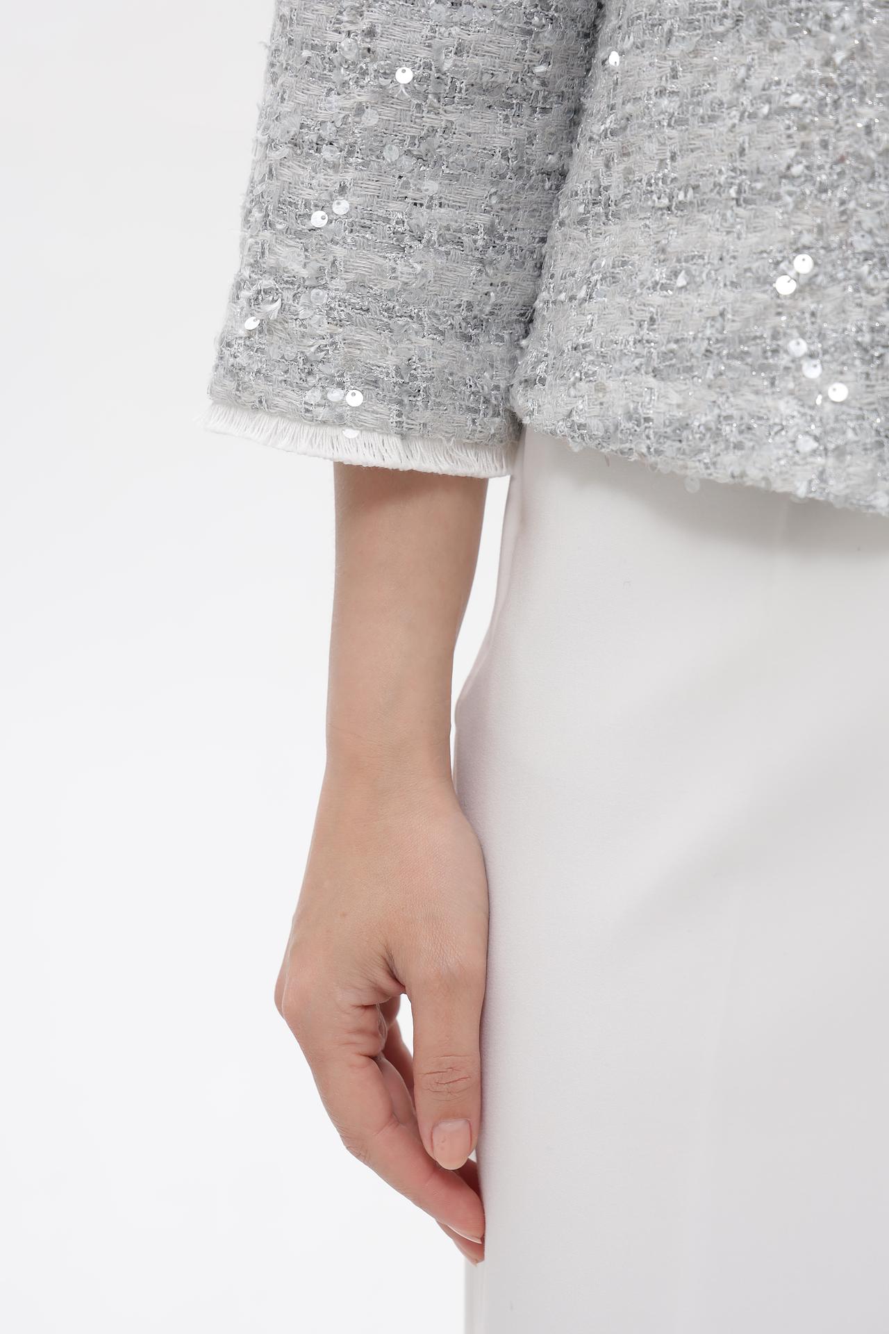 Элегантный женский жакет Bianca в серебристом оттенке – идеальное дополнение к вашему гардеробу для создания как повседневных, так и праздничных образов. Этот стильный жакет выполнен из уникальной твидовой ткани, обогащенной мерцающими серебристыми пайетками и деликатной метализированной нитью, что придает изделию особое очарование и блеск. Укороченный фасон и классический крой без воротника с V-образным вырезом подчеркивают изящество силуэта.