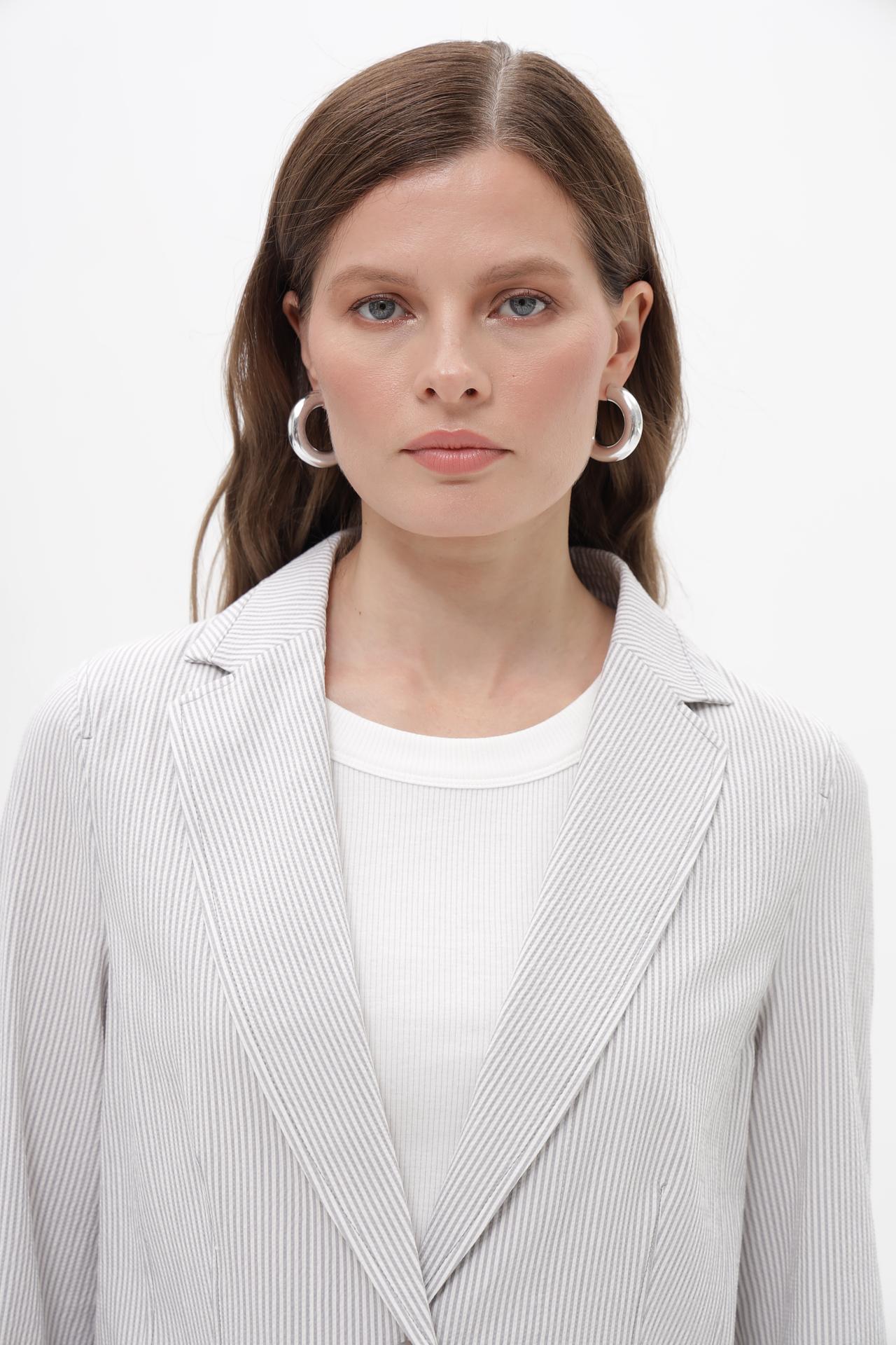 - Дизайн: Классический пиджачный крой с лацканами и одним пуговицей. Тонкая полоска придает изящество.