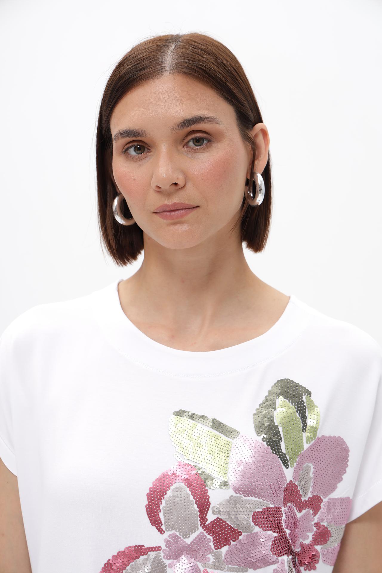 - Оригинальный дизайн. Цветочный принт придает образу изюминку и делает футболку запоминающейся.