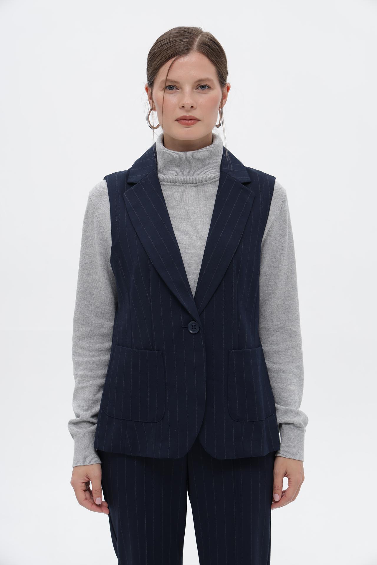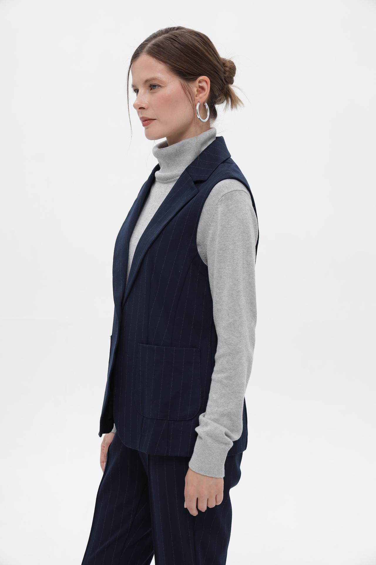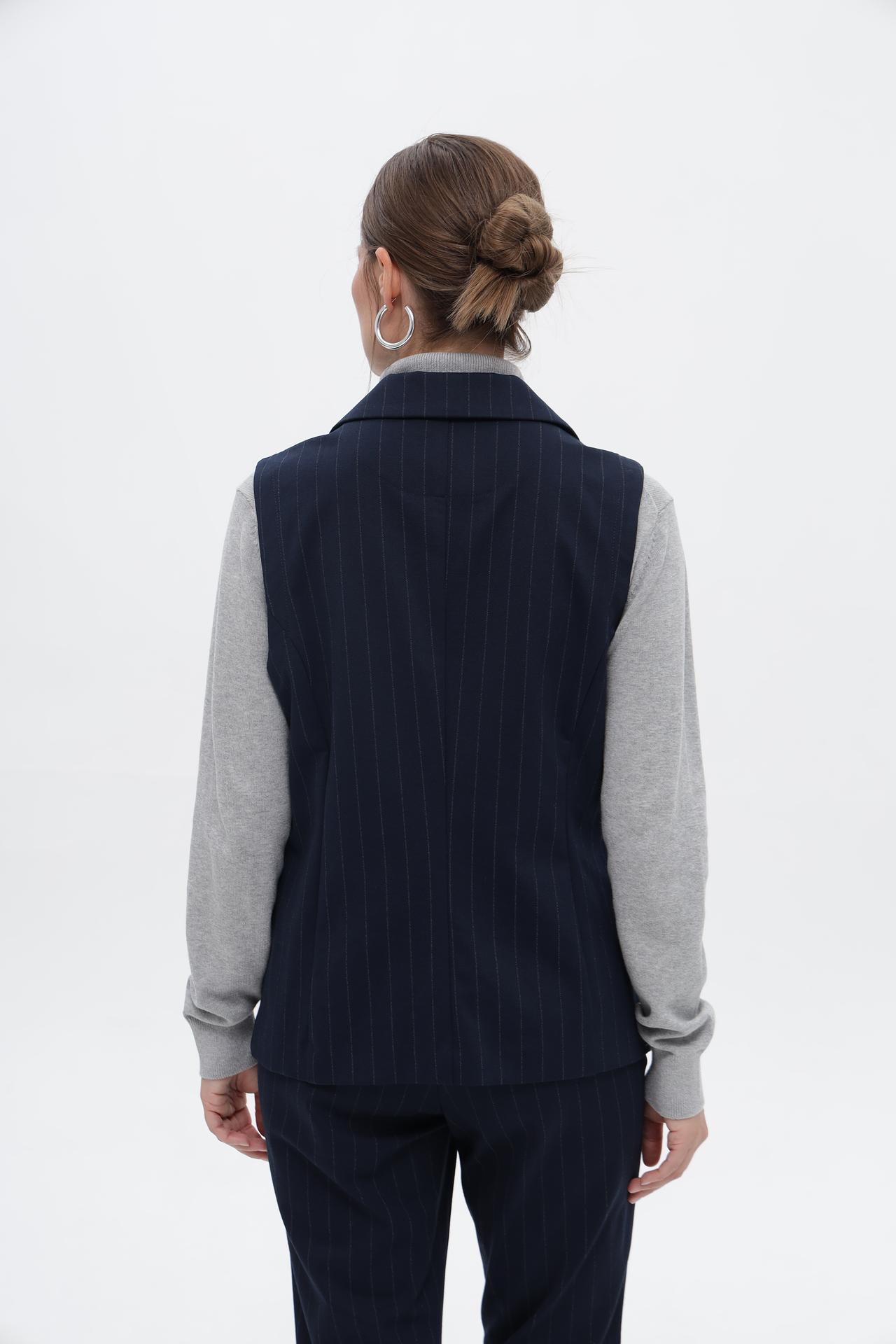 Элегантный жилет Bianca — идеальное дополнение к вашему деловому и повседневному гардеробу. Классический темно-синий цвет в сочетании с деликатной вертикальной полоской создает строгий, но утонченный образ. Этот жилет прекрасно подчеркнет вашу индивидуальность и добавит изысканности любому наряду.